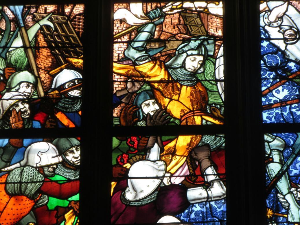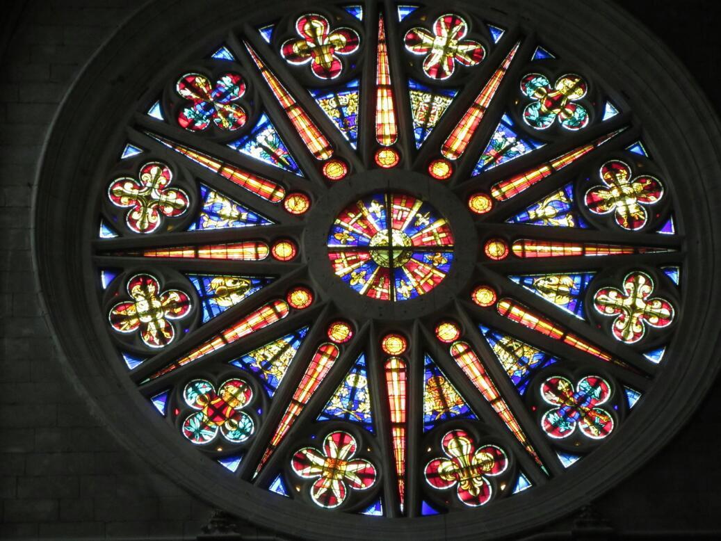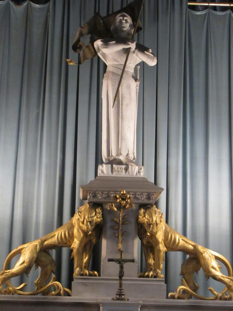 In the cathedral we scared up someone to stamp our Creantiales. Because Orleans is Joan of Arc town, we also noted lots of Joan stuff. For example many stained glass windows are a little cartoonish, telling the Joan story.I also looked to get photo of a Joan on horseback statue, but the one in the cathedral was too stylized for my taste.