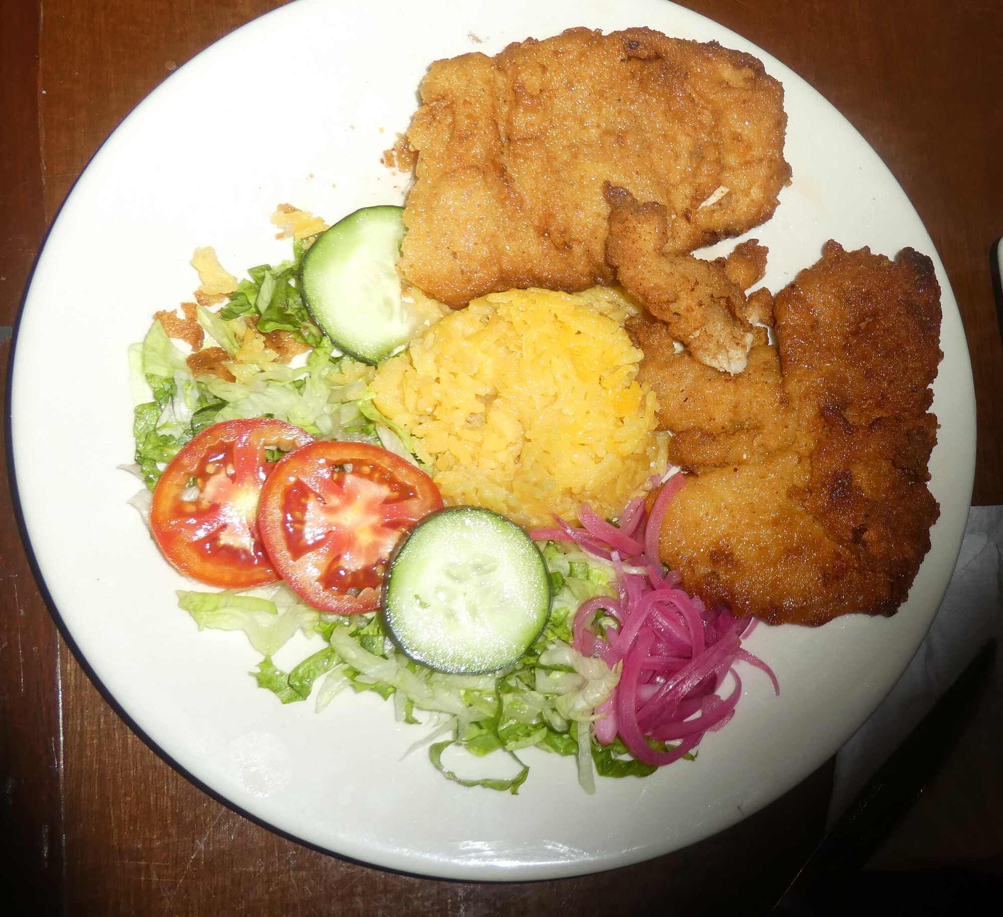 Dodie notes that this was the first real food for me in about a week. It has been basically oatmeal and instant noodles while the tooth has been giving the most problems. But at last I could order what was essentially fried chicken. It was great, having been marinated in or doused with lime juice. And those pink onions! They are mild and lightly pickled. I love them.