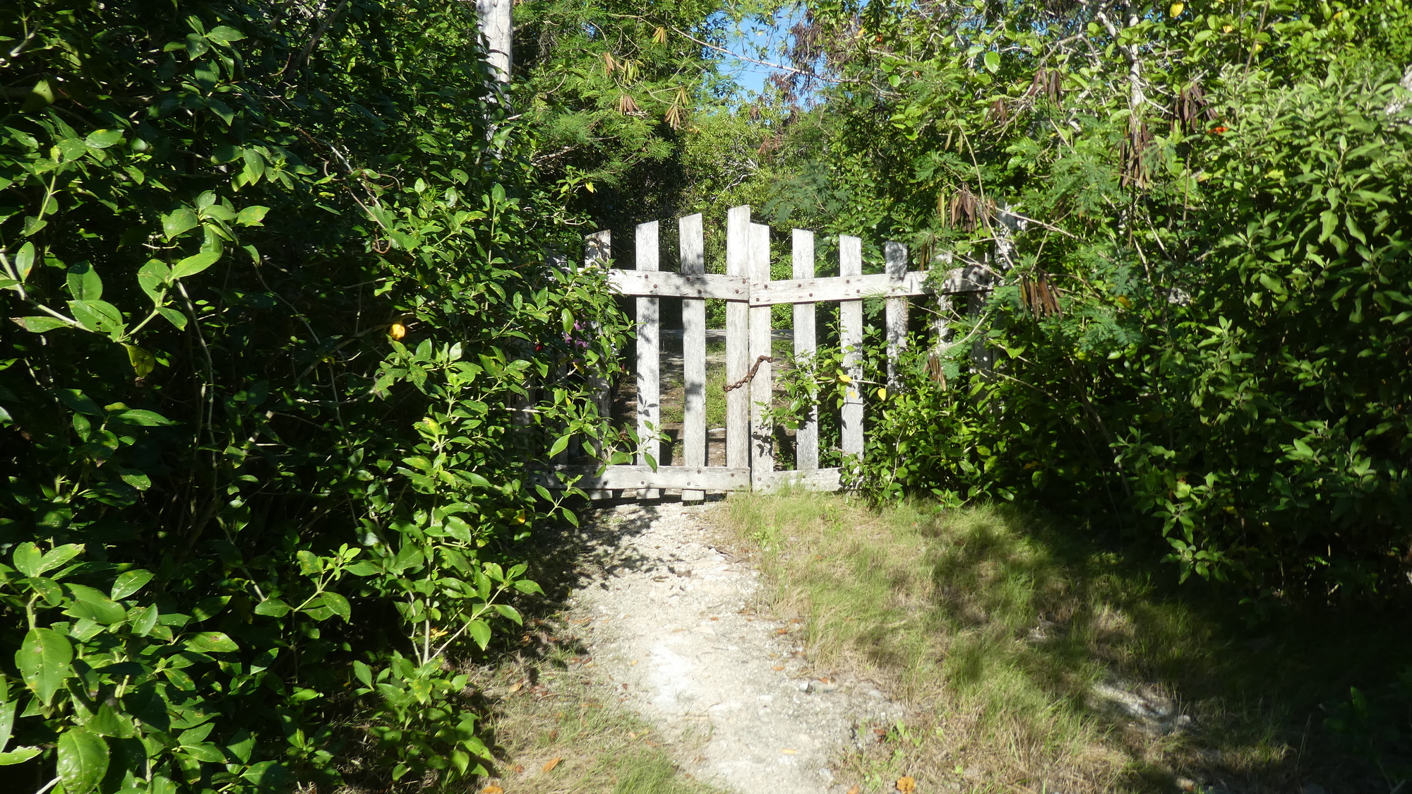 We found the start of the trail, easily, because we had flagged it in Osmand. Right off the road there was a giant puddle with no dry way around, so we accepted one wet foot each, just to start. A sign about the biosphere preserve was faded and overgrown, something that portended the rest of the trail. By the sign was the closed gate, locked with a rusty chain. Grampies of course see red, or rather "route barrée" in such cases, and are usually not detered by it. So we locked our bikes in front of the gate, and snuck around it.