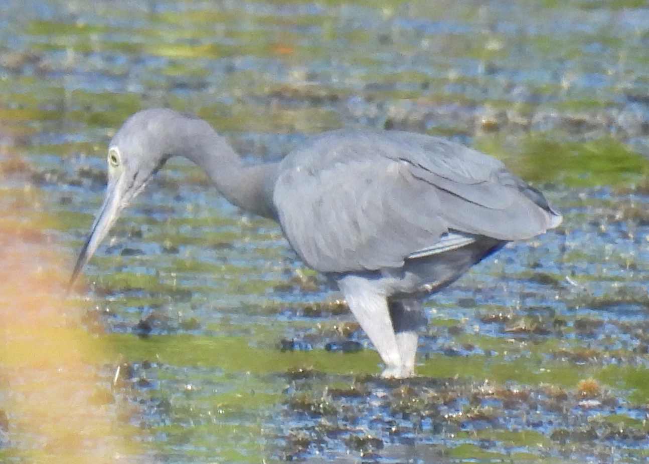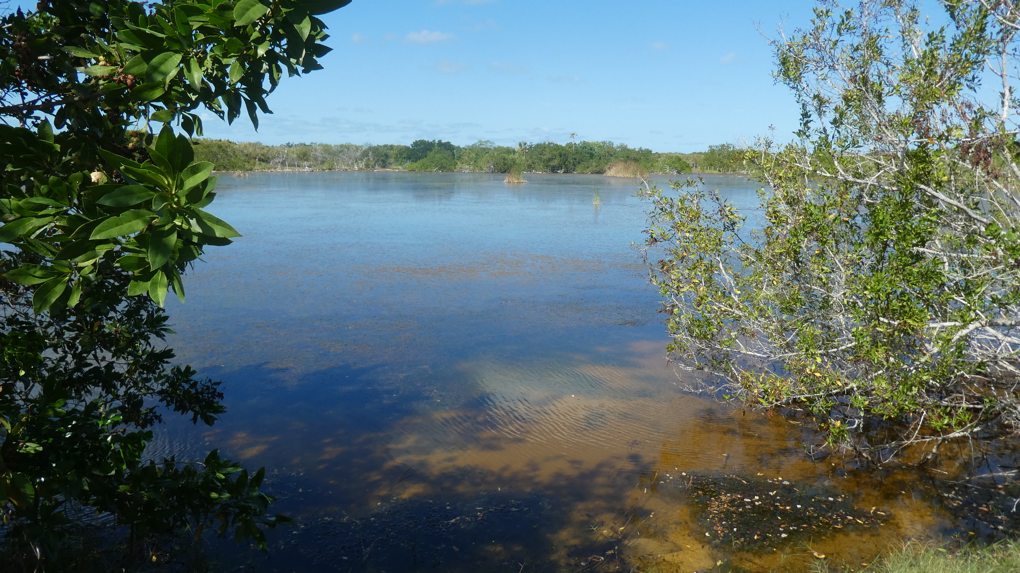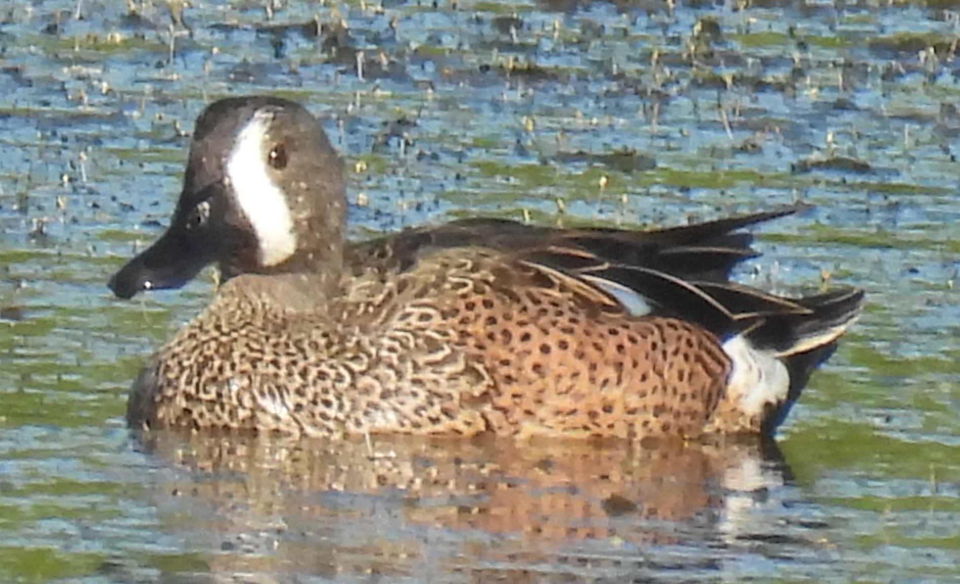 As usual, any bird life clustered on the far side, challenging the camera zoom and the steadiness of my hands. Even so, we snapped one very large flamingo, a little blue heron, and some blue winged Teals.