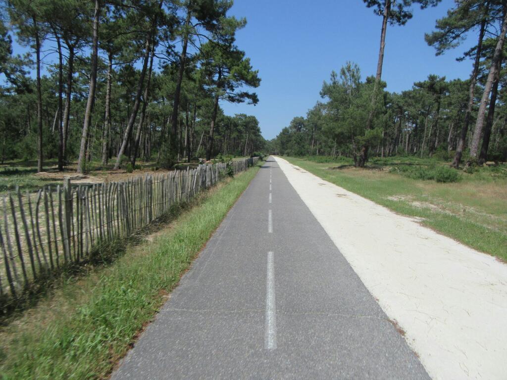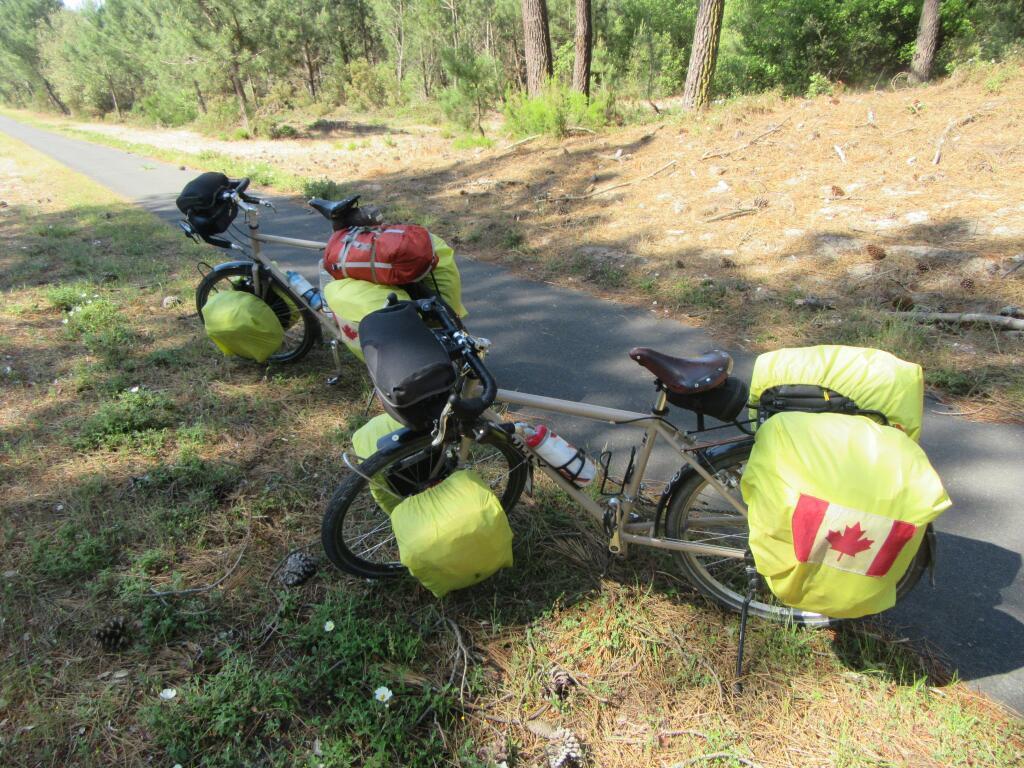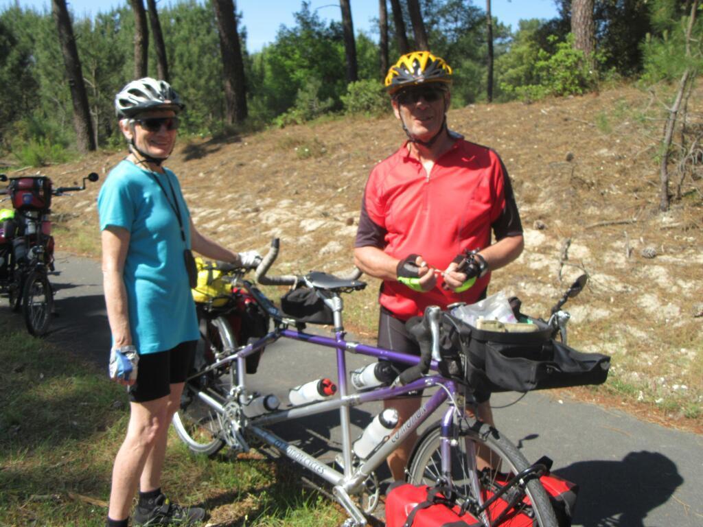 We were straightened away and heading for Maubuisson when two long distance riders on a tandem caught up with us. Hello Canadians! they said, or something like that. They were Canadians too! Whats more, they were from British Columbia. Even more, they were from Lanzville, which is about 50 km from our house, on Vancouver Island. So this was Vi(olet) and Jack. We realize now that we did not properly learn about their itinerary, though they were heading for the same town of Soulac and the ferry to Royan, as us. It's amazing that we did fail to gather this information, since we had a great time standing around and talking about - something - for a good long while.