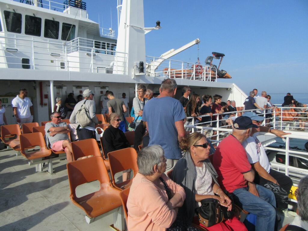 The ferry was quite a large ship, for just a 30 minute crossing, but I guess lots of cars need to use it. The public seemed to be in good spirits on this sunny day, going for a little sea cruise. In the lounge, lots of little coffees were being served up, and the counters had lots of pastries. Many people sat out on the front deck, to watch the lighthouse at the dock quickly recede and Royan quickly approach.