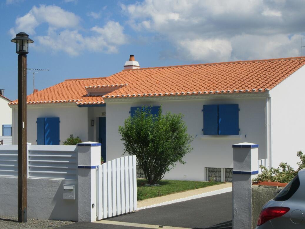 The style of the houses I m talking about is that of a simple low bungalow, with orange tiled roof and bright white stucco walls. Typically windows and doors will have shutters, and these will be blue.