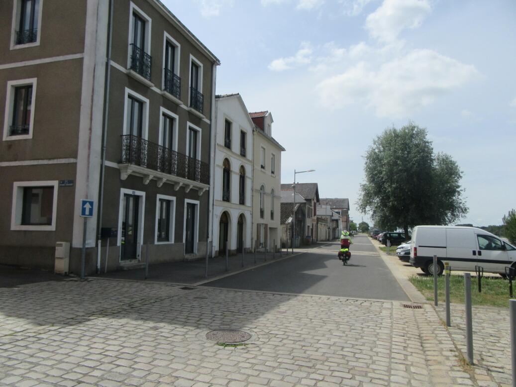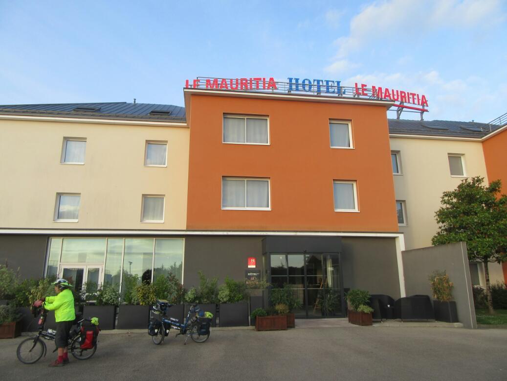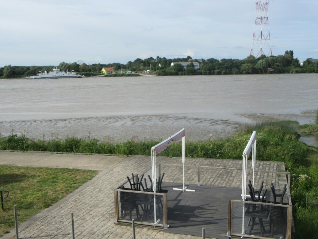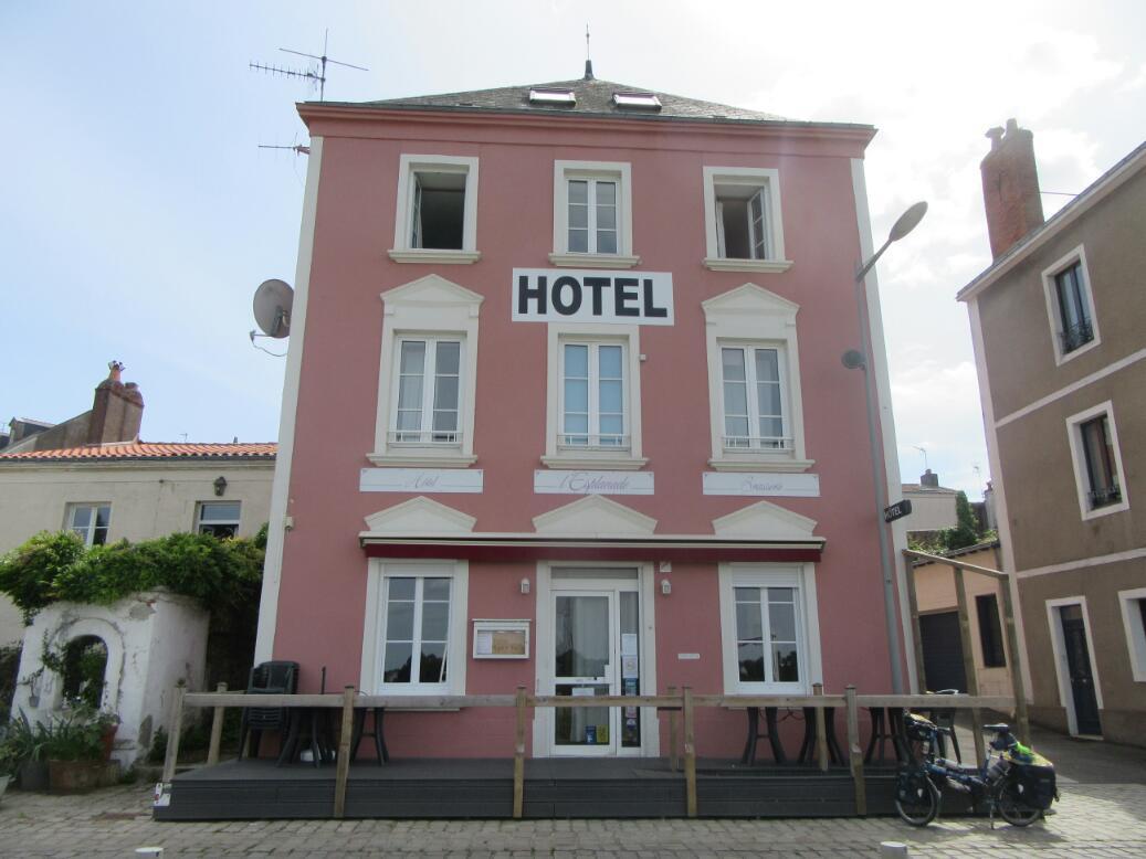 Suitably fuelled up we now had to do those 20 km over to Le Pellerin. Michel had found us a little hotel (the little hotel) in town, which is called l'Esplanade. It faces the river and the ferry and is very atmospheric. Used to be the post office in the 19th century. I had emailed them last night but no response, so at noon I called (when not fighting with the restaurant over crepes.) The hotel lady seemed scattered, or maybe she could not hear or understand me, but eventually I was satisfied that they would be expecting us. She did mention that reception would only open at 5.
