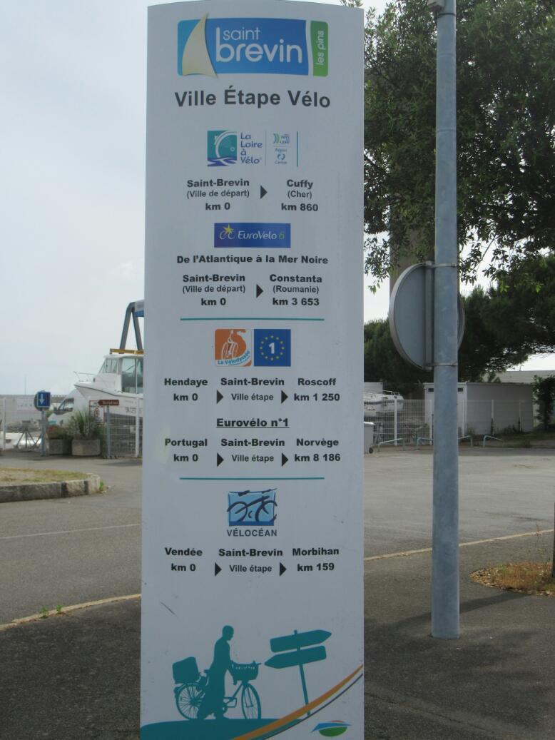 The next bit of the day's odyssey took us through boring residential areas, past St. Brevin. As usual, the routing kept us well away from any services, open or not. But we did go by the famous sign that marks the intersection of several major European bicycle routes. There is Eurovelo 1 that goes from Norway to Portugal, and Eurovelo 6, that goes from here to the Black Sea. Piggy backing on these (or vice versa) there is the Velodysee/Velocean from Hendaye, and La Loire a Velo, that leaves here for 860 km up the river. We are just coming off Velocean and jumping on to Loire a Velo here.