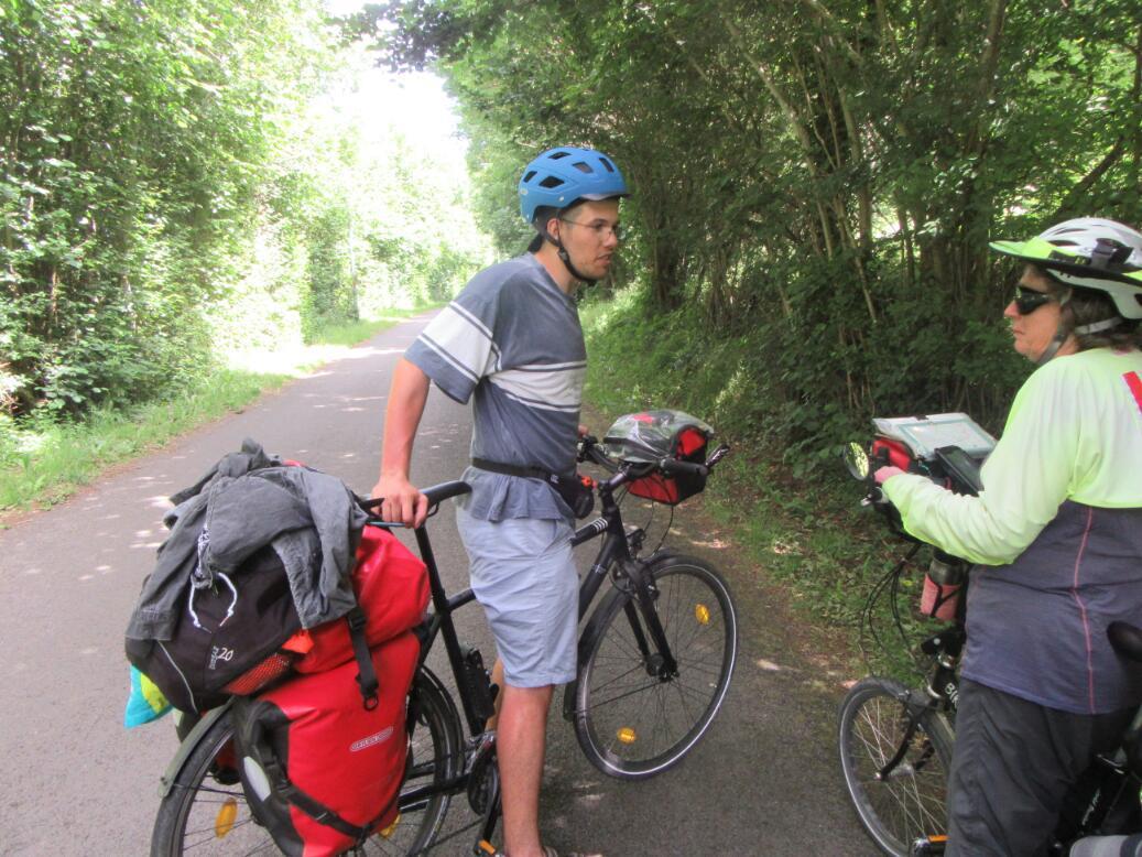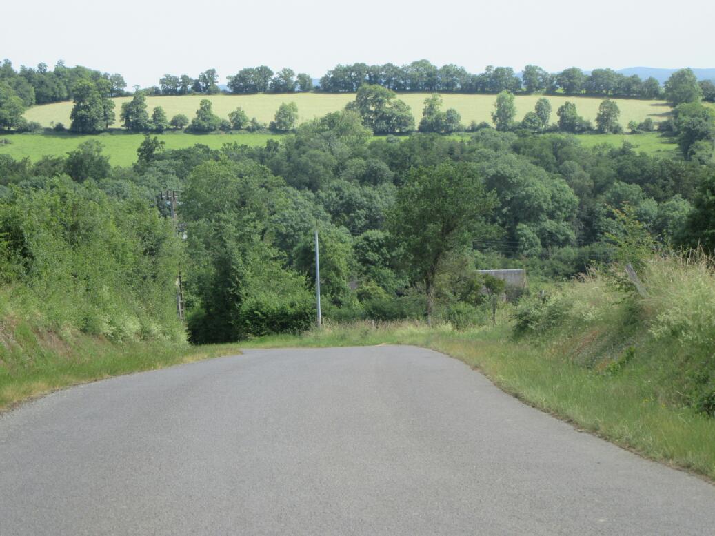 The trail ended at a point where we had to choose one of two alternatives for the next 30 km. We could keep east to reach Pont d'Ouilly or we could take a slightly longer westerly route to the same end point. We knew we were approachiing a hilly area called Swiss Normandy, and we were leery about which route might hit it first, or be it. We chose east, just because that was shorter in total length, at 27 km.