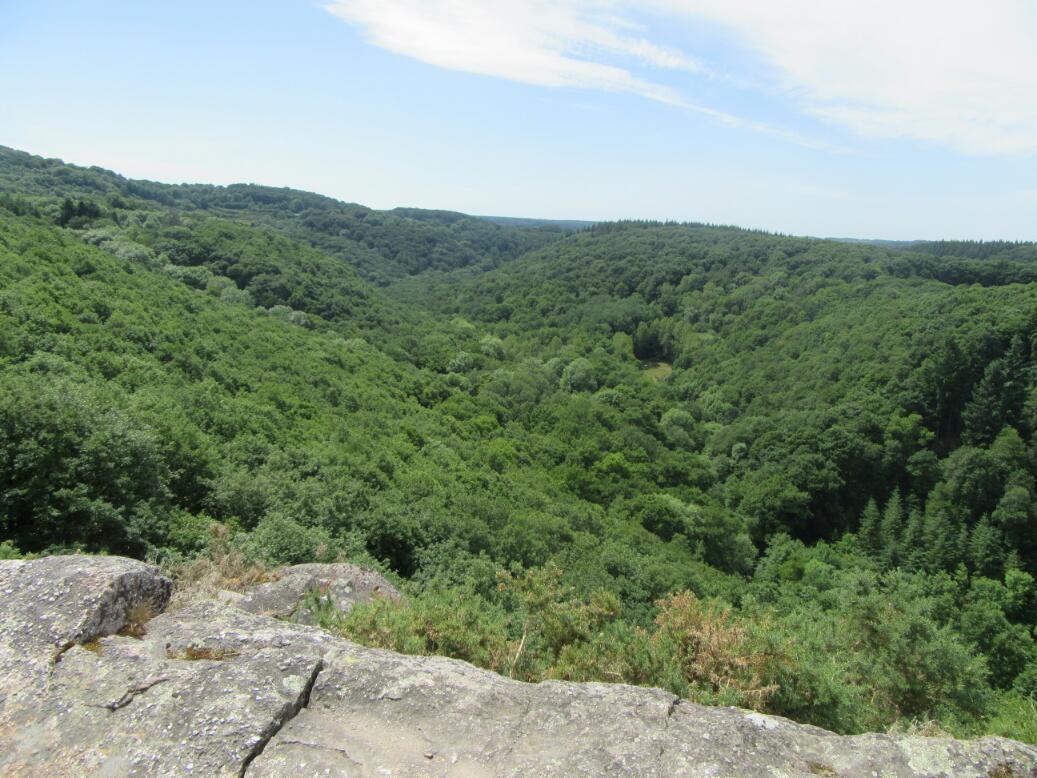 The first bit of Swiss Normany we hit was called Roche d'Oetre. This is a point where we have climbed up the back of a cliff, and the cliff face alls off beside us to the left. The cliff face area seems to support some form of zip line activity, plus there is a restaurant and a picnic area. We chose this as a place to eat lunch. We were approached there by a couple from Rennes who had trained to Caen and were cycling to Saumur. These were Veronique and Guy. who not only are cyclists but who have written "Sea Kayaking Guide Brittany: 60 Paddles". We tried to tell them what we knew of sea kayaking off Vancouver Island's west coast, where it is a very big activity. Again, lots of fun to talk with fellow "sportspeople".