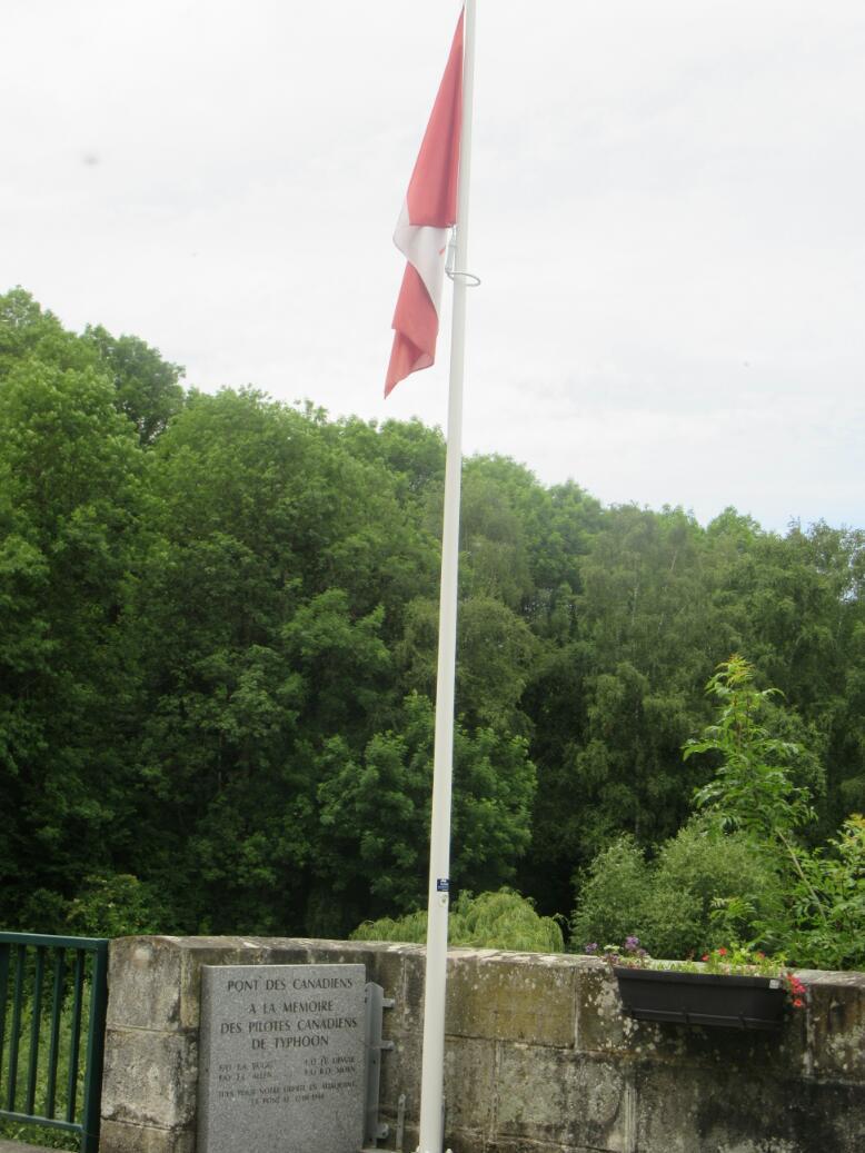 It produced a bit of a chill to suddenly see our flag by a bridge on the Orne. The plaque there did not tell much of the story, only that four aviators had been killed during the liberation of the town nearby. A newspaper account also says that the flag had been restored in 2016, when a random Canadian passed by and found it in disrepair.