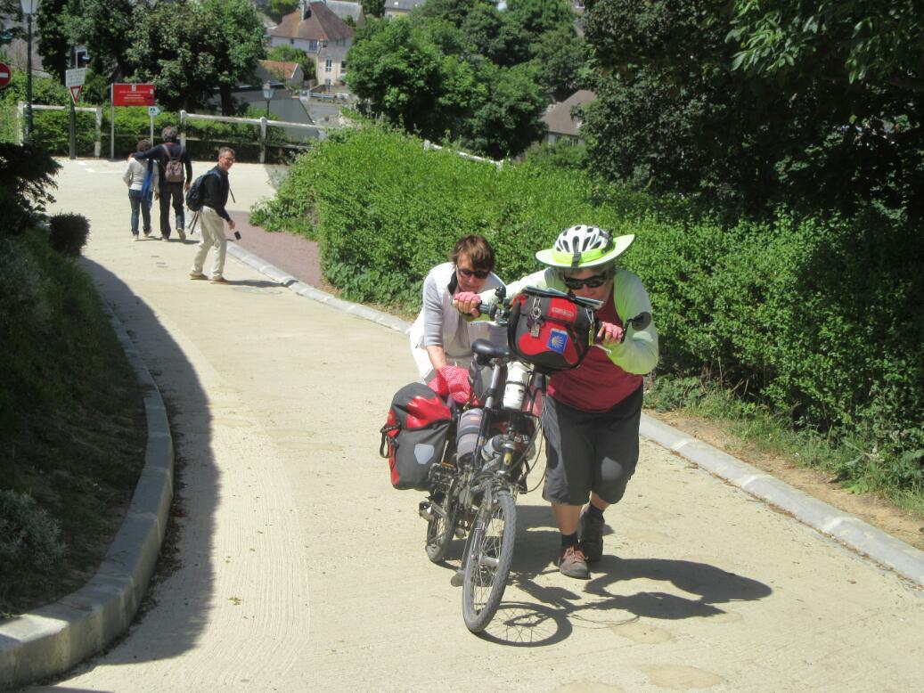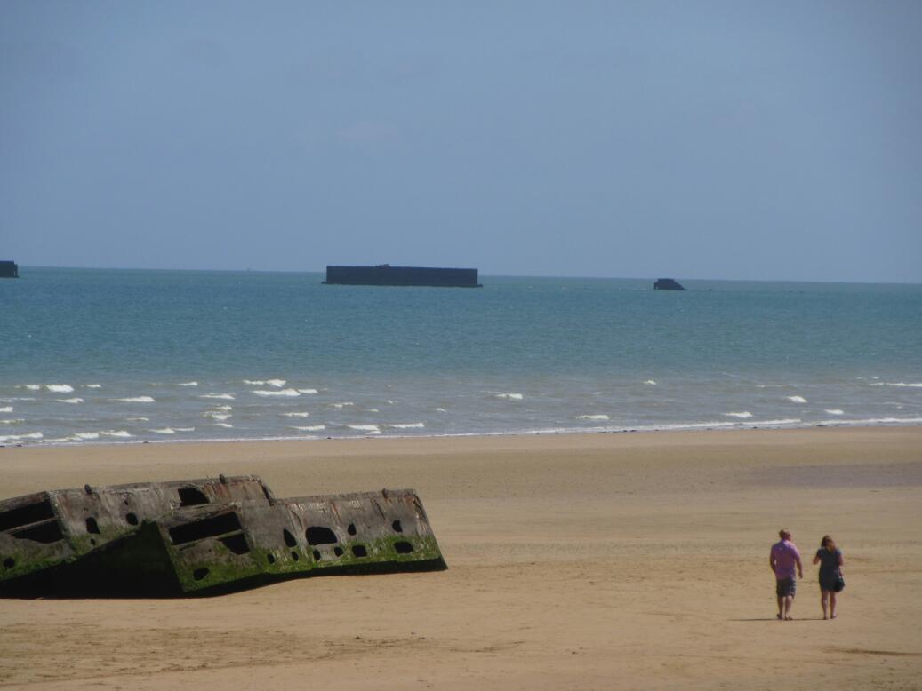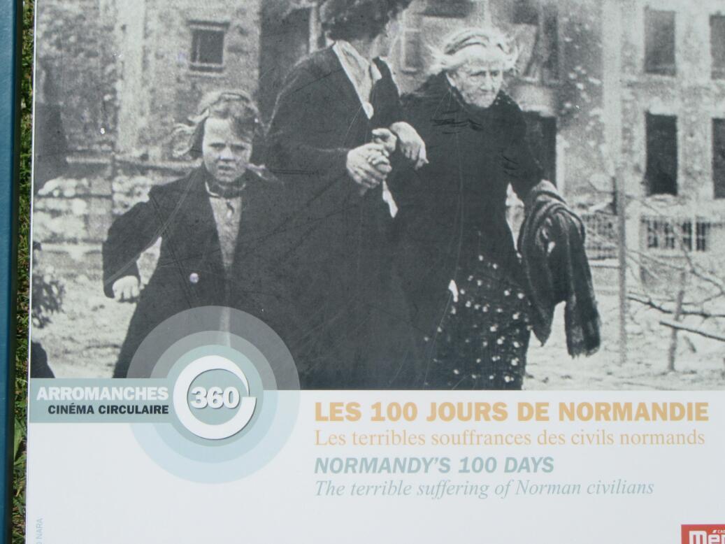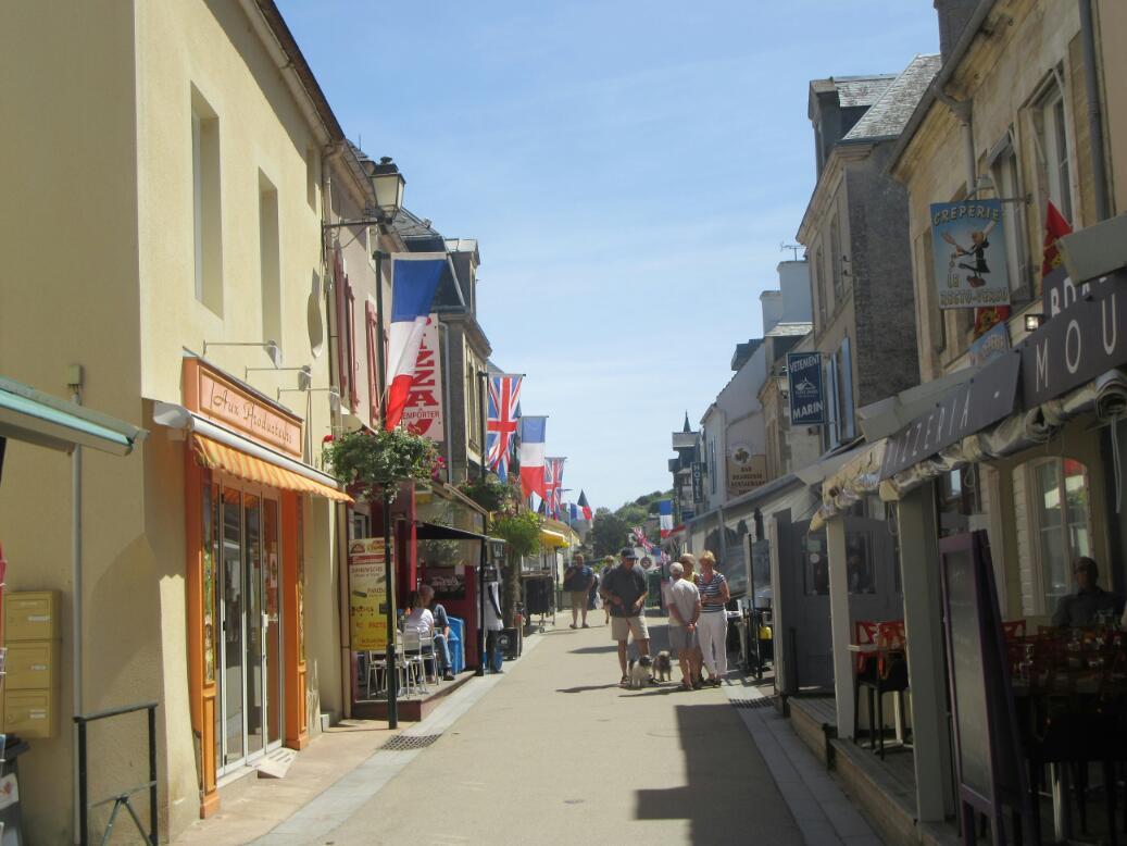 The route (Route de Ryes - remember the guy?) necessarily goes down into Arromanches town. That was ok, because we got a further peek at the place, and ate our lunch outside the D Day museum there. In the gift shop we bought a map of the evolution of the Normandy front following D Day- something to study later. Then we pushed up the steep hill to the 360 degree film presentation. (The path is steep. Surprisingly a Dutch lady that had just come down turned around and helped Dodie push up. Really nice!)