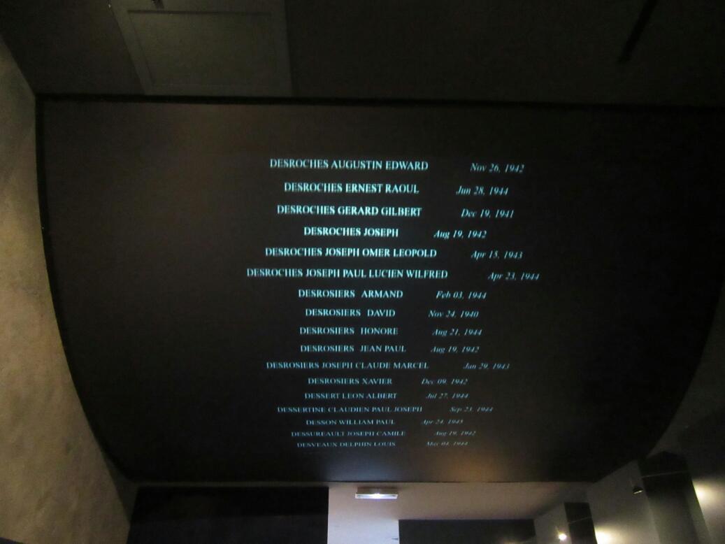 The main impact, though, came at the end. First there was an overhead screen listing the names of the fallen, in alphabetic order. We were thre for the Desroches and Desrosiers. There were 45,000 Canadians killed in WWII. It takes 13 1/2 hours for all the names to scroll by.