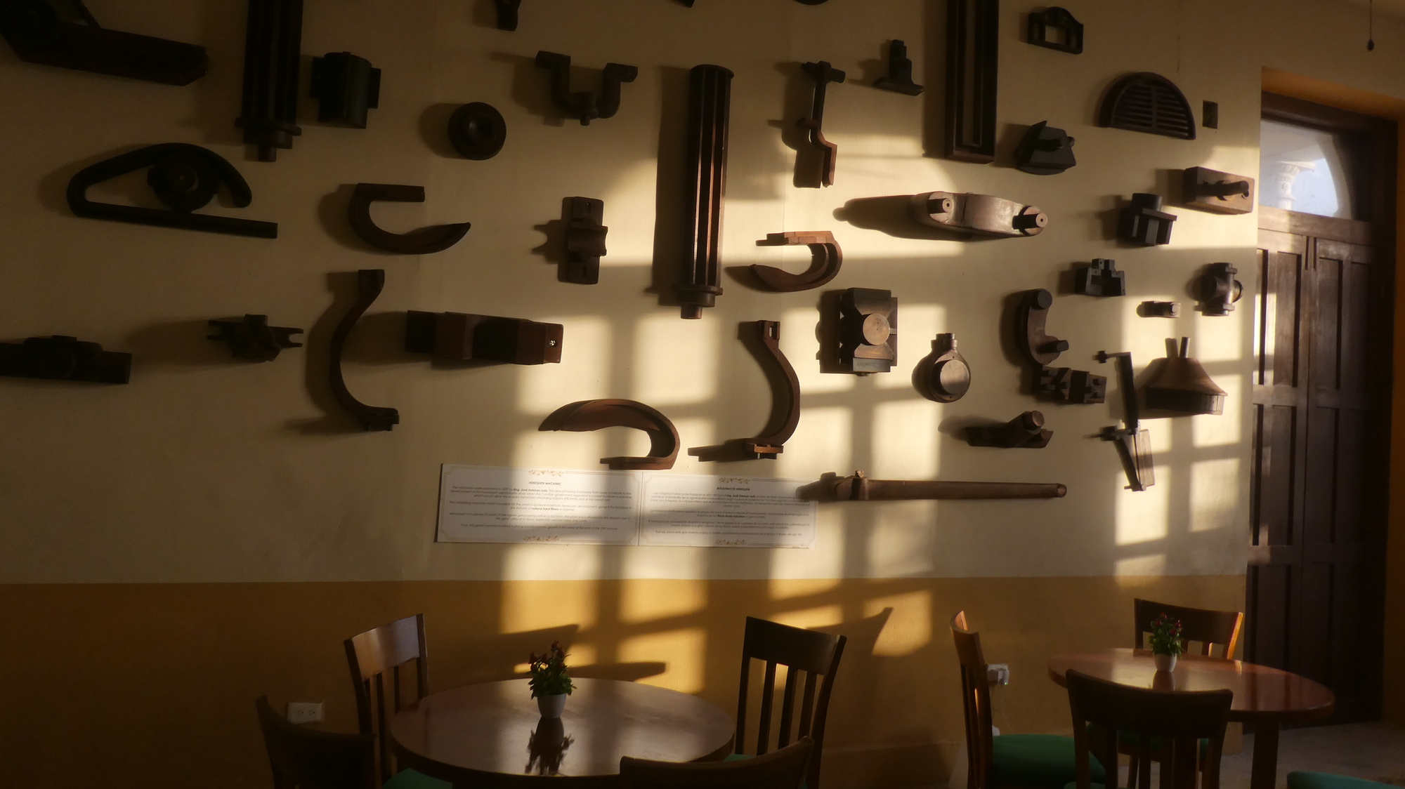Our mansion-hotel was built in 1925, during the henequin boom. (Henequin is a kind of agave that has tough fibres. It was processed into rope and binder twine, and was sometimes called "sisal"). So it figures that the dining room wall has as decoration parts of a henequin processing machine.