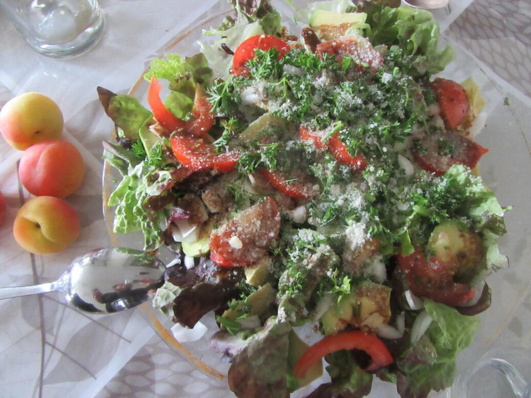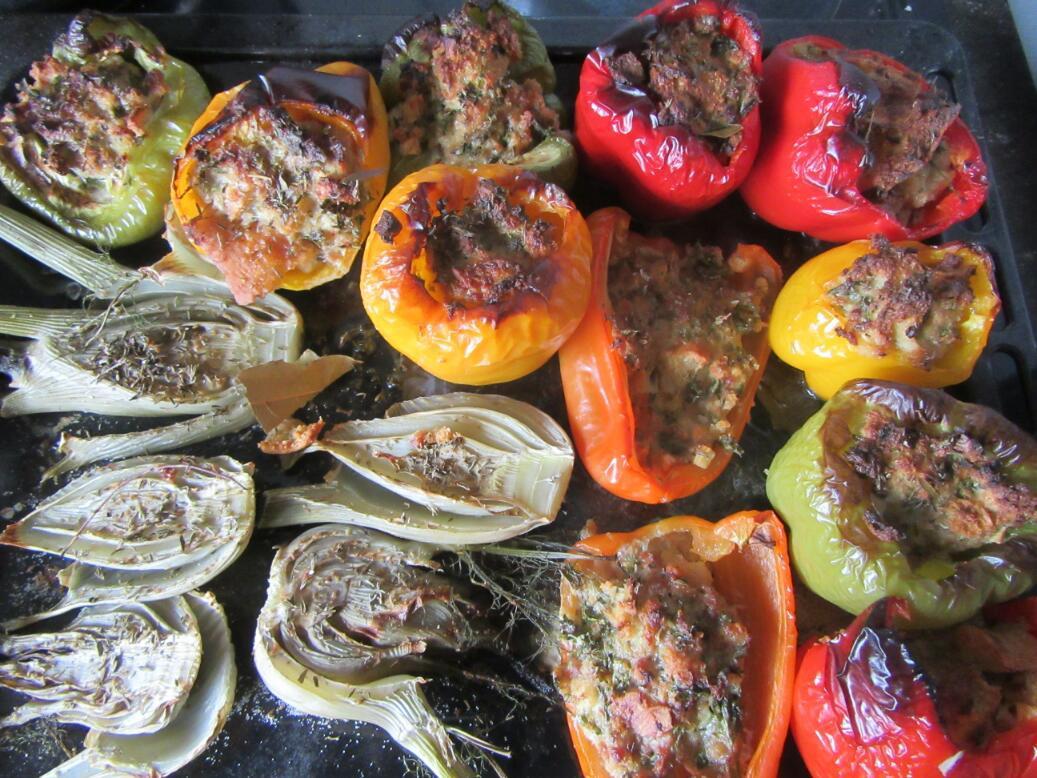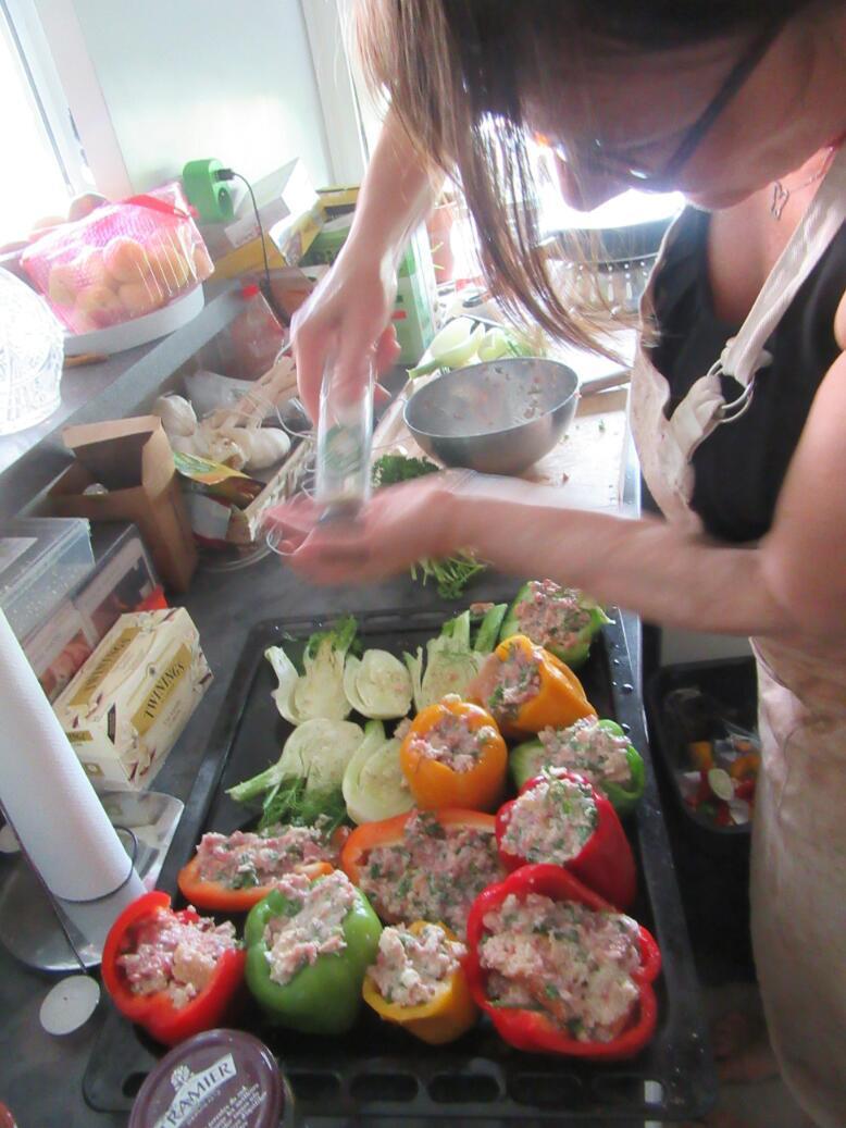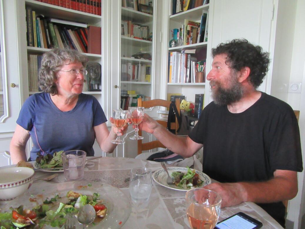 Corinne brought home the groceries and prepared firstly a salad, to go into my salad gallery. Then it was peppers stuffed with sausage meat. And there was roasted fennel. Corinne insisted that in France you must drink wine, so we did. It was a rosee from Provence. With ice cubes in it, in this hot weather, it was actually pretty good.