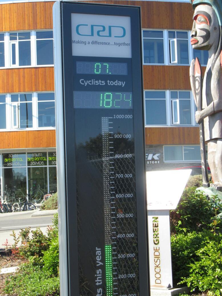 The Galloping Goose is a very successful bike way. Here a counter shows 1824 users today, and it is just about 9:30 a.m.!