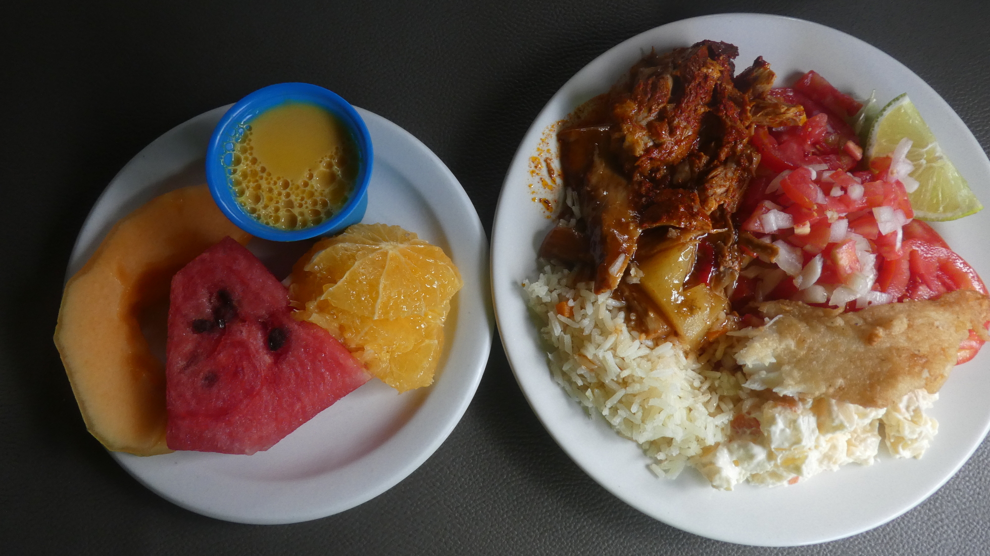 The included buffet is not a buffet in the way we understand it. Rather the plates and food are behind glass, and you indicate to a server what you would like. The trick then to getting enough is to keep pointing to stuff. But the capacity of one plate is the limit to how much you can pig out. This is what I got. There was salad, fried fish, cochinita pibil, and pork loin in plum sauce in there.