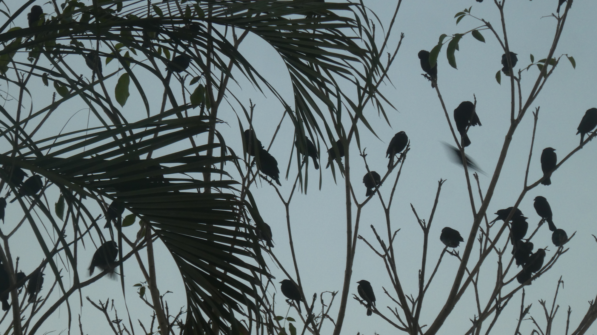 In Mexico in the central squares Great tailed Grackles gather in large numbers to roost in the trees. In the evening, their screeching can be deafening. We are used to that, but this morning we arose at the hotel to find the trees full of a different kind of black bird - the Bronzed Cowbird.