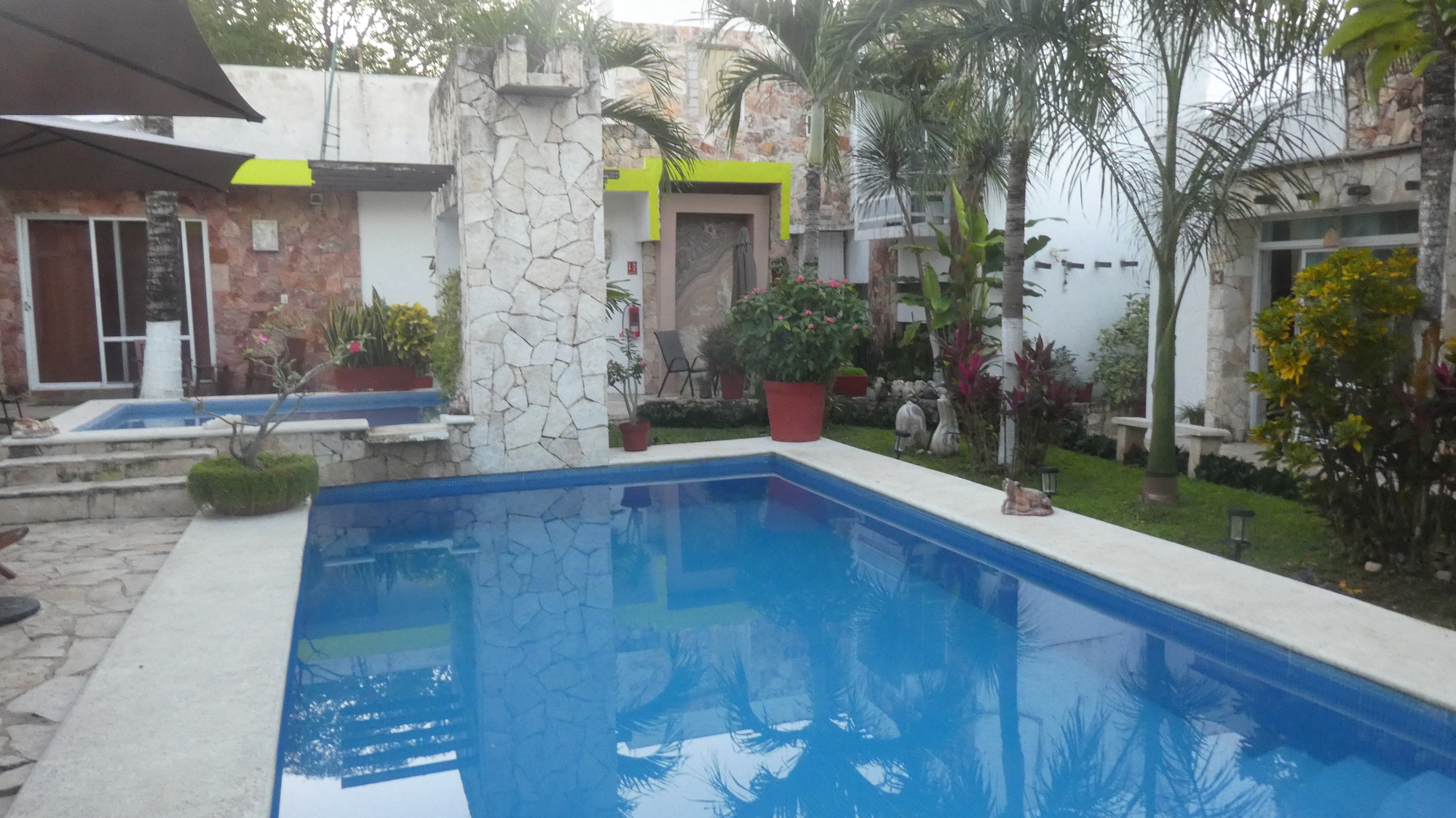 But inside it is an oasis of nice plants, good level entry rooms, and a decent pool.