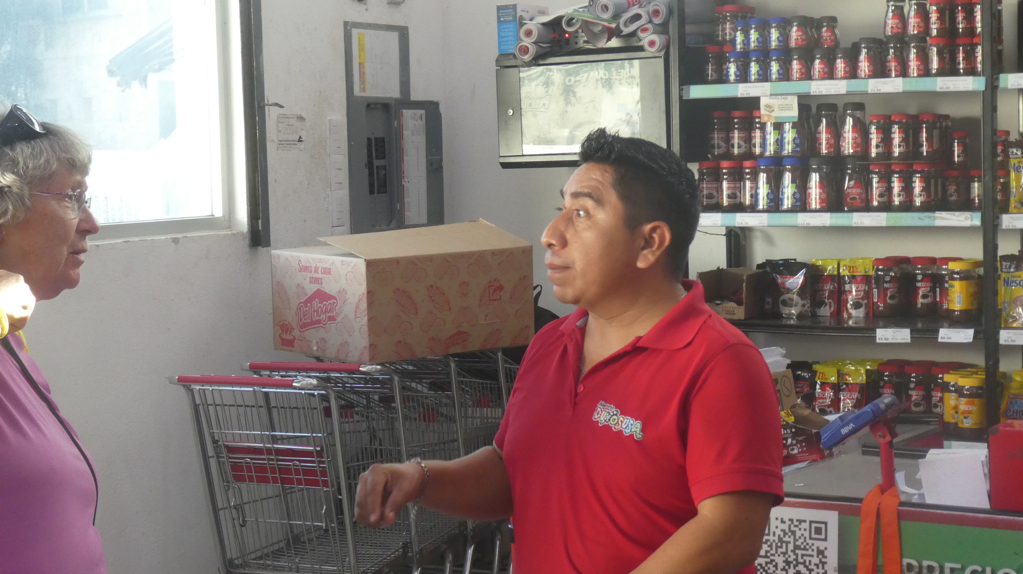 Our schedule for the day allowed time for a stroll down the main street of Piste, which is also the highway to Chichen Itza. We stopped into a little grocery, looking for hot chocolate powder. Dodie always chats with the checkout staff. Since they are invariably Mayan, the chats are always so sweet and pleasant. They are just a totally sweet and pleasant people. In the photo below, the man is teaching Dodie some words of Mayan. We find them always eager to do this, as they remain proud of their heritage and language.