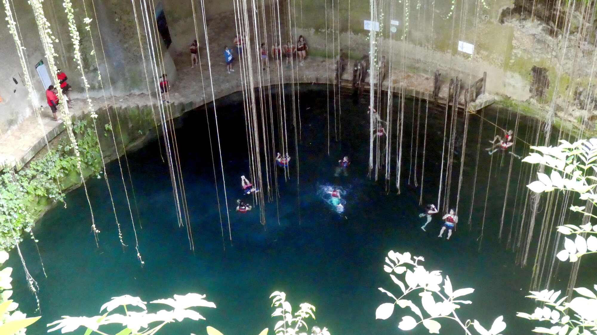 After dropping our stuff at Delores Alba, we walked directly across the street to the Ik Kil cenote. Ik Kil is one of the nicest and most dramatic cenotes and sites that we know. It is the type that is open to the sky, with plants and vines trailing far down to the water level. The grounds are lush and tropical, so pleasant.