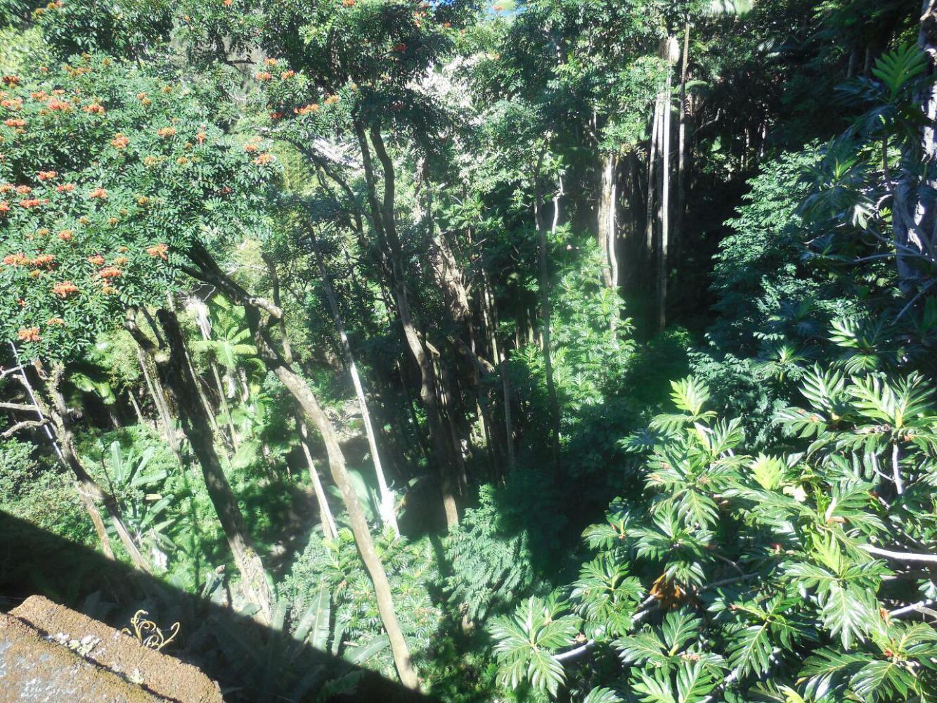 In most cases the bridges cross the stream gulches high above the water and without descending much. But there are three gulches where the road goes down down, crosses, and then climbs up, up. These gulches are the Maulua, the Laupahoehoe, and the Ka'awali'i. From the look of the map, Maulua looked to be the worst. But though it duly went down, down, and up, up, we came through it quite well. Laupahoehoe also seemed like a monster, but again, though tough it was not the end of our world.