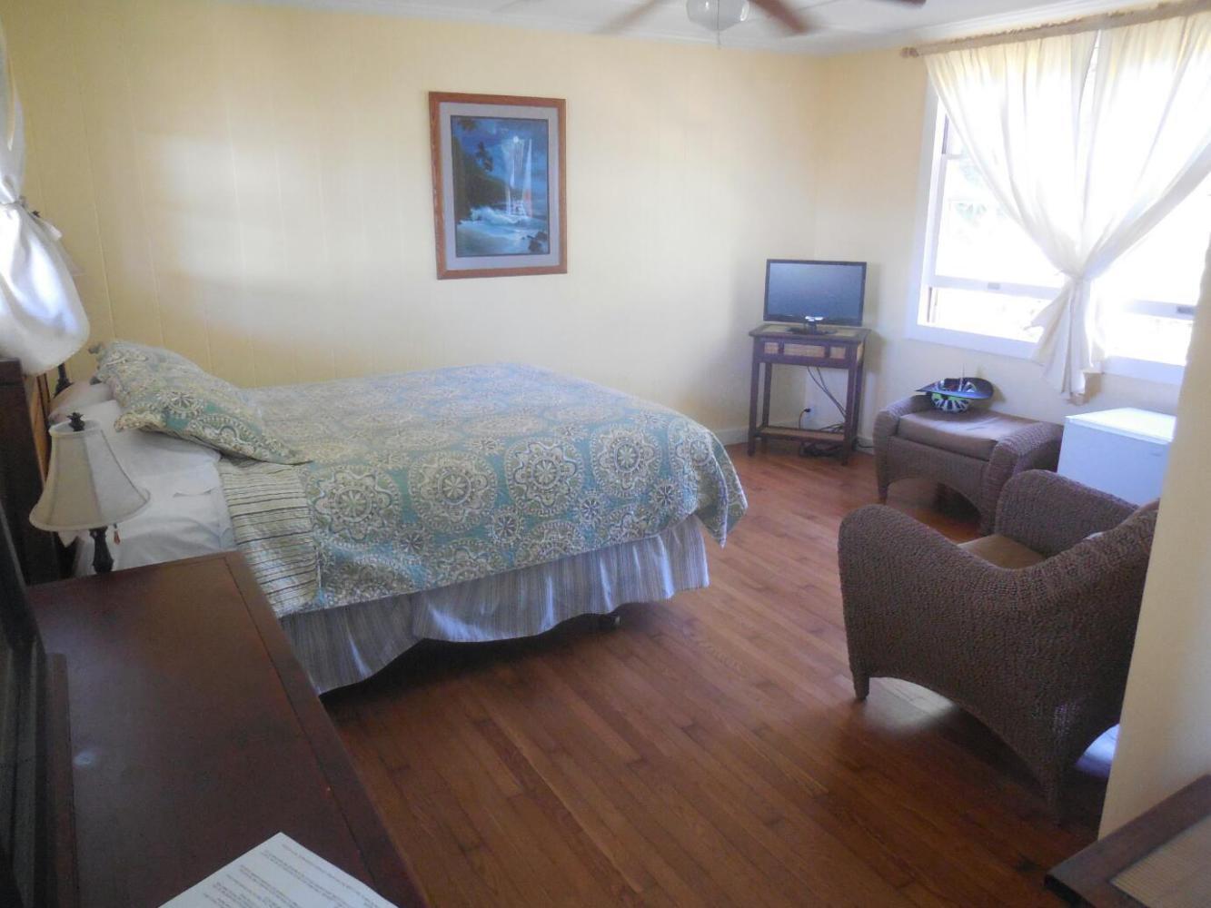 Ẁaimea Country Inn really is pretty good, by Hawaii standards. With its coodinated furniture, vaulted ceiling, TV, fridge, and large rooms, it is a step up from Manago or Honokaa hotels. OK, so there was a mysterious wet spot in the carpet that did not go away, and the toilet flush handle was broken, but we were ok with that. Dodie finally saw red, though, when the Hawaiian expensive sliced meat and cheese we put in the fridge spent the night at room temperature because the fridge quit.