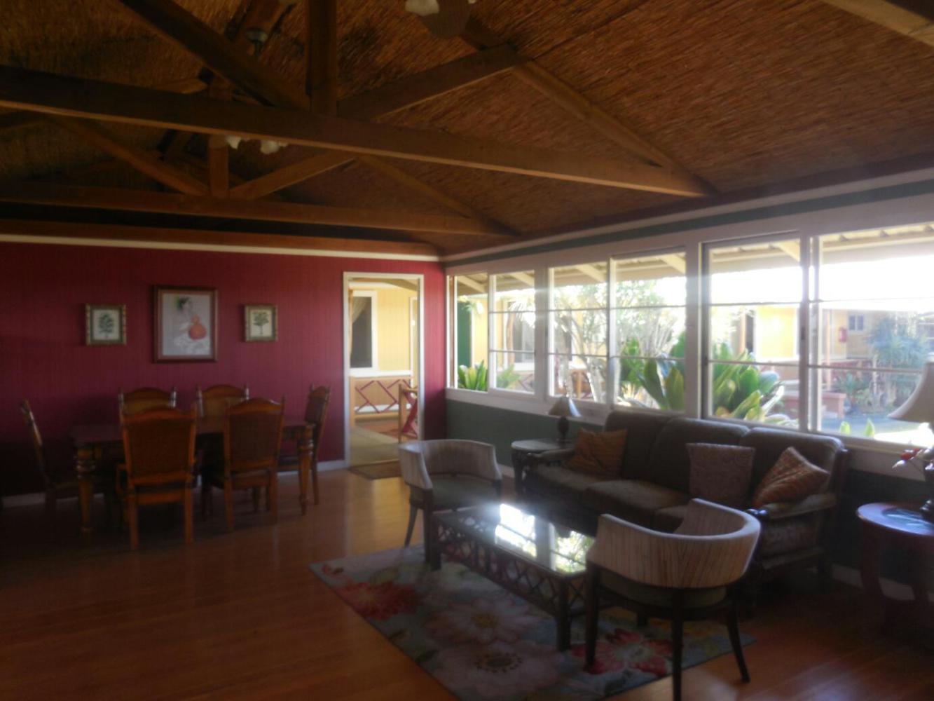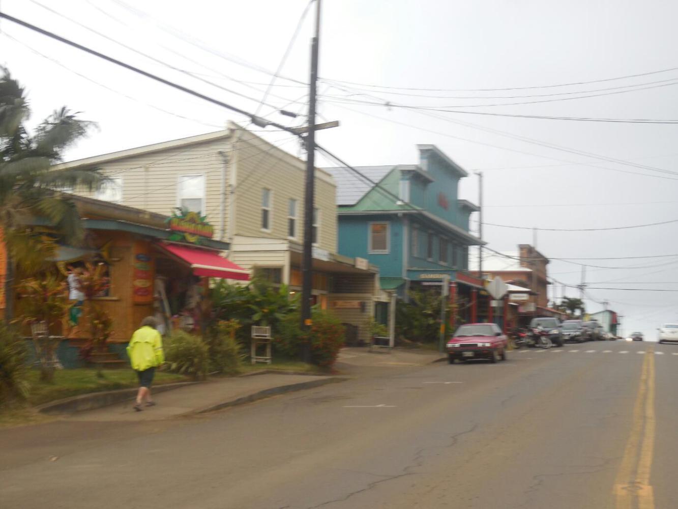 The Kohala Village Inn is right in the heart of Hawi, the point at which the Kohala road joins the highway from Kona. As with the other Hawaiian towns, Hawi fell into disrepair when sugar died. But now it seems to be a relatively thriving collection of a couple of dozen tourist oriented shops, a few restaurants, and the Village Inn. The Village Inn has had some nice construction done in recent years. It still styles itself "plantation style", but it has some really nice spaces (like lobby and meeting room) the rooms seem stylish, and all have hardwood floors.
