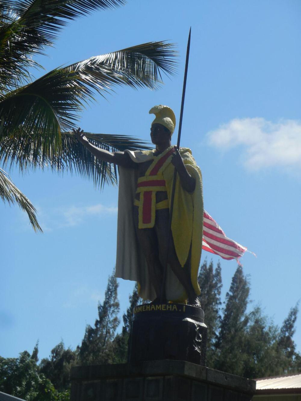 Heading east, there is another little town like Hawi, called Kapa'au. It's a touch smaller perhaps, but has the same cluster of tourist shops. Kapa'au has two other special attractions. The first is a statue of Kamehemeha I. This is the "original" one, while a copy stands in Honolulu. The story is that in 1878 the Hawaiian legislature commisioned the statue, which was cast in Paris and shipped. The ship went down around the Falklands. The Hawaiians used the insurance money to secure a dulicate statue. But later the original turned up, having been salvaged. So that is the one we have in Kapa'au.