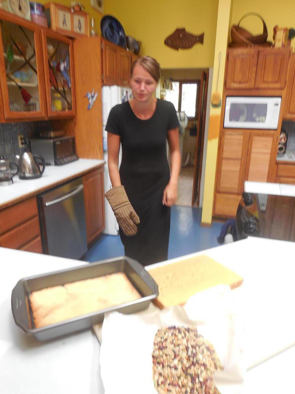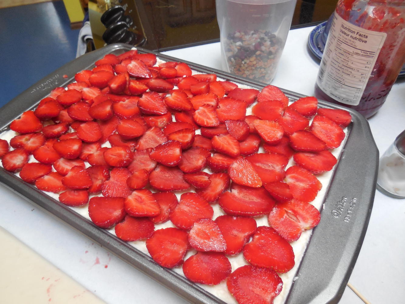 As you can see, my mind is a jumble, and this was reflected in several horrible tries before I gave up and just started saving my pennies for a return to Germany. Of course, we do now have our tickets, and this blog today says 24 days until start. Tomorrow is the last day when we can visit with friends and family, before heading out for Idaho, where Grampies Grand Adventure will come before we fly to Brussels. So for tomorrow's festivities I asked our German friend Sandra to use a can of Polish poppyseed filling that we happen to have, to make strudel. But seeing as there are so many strawberries in the garden, she suggested that she would make erdbeeren schnitte! Wow!