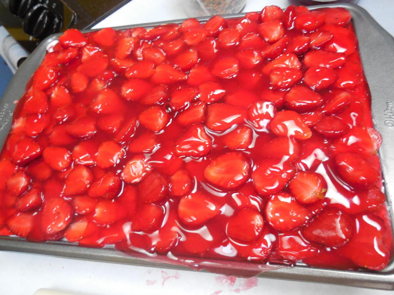 The family today universally praised the erdberren schnitte. There was still lively discussion about the thickness of the cake layer, overall height, amount of glaze, ability of the slices to be cut neat and straight, with no cheese crumbs, etc. etc. On the other hand, there was none left on any plates, and the surplus slices got spirited away by interested parties, so it was really a total success.