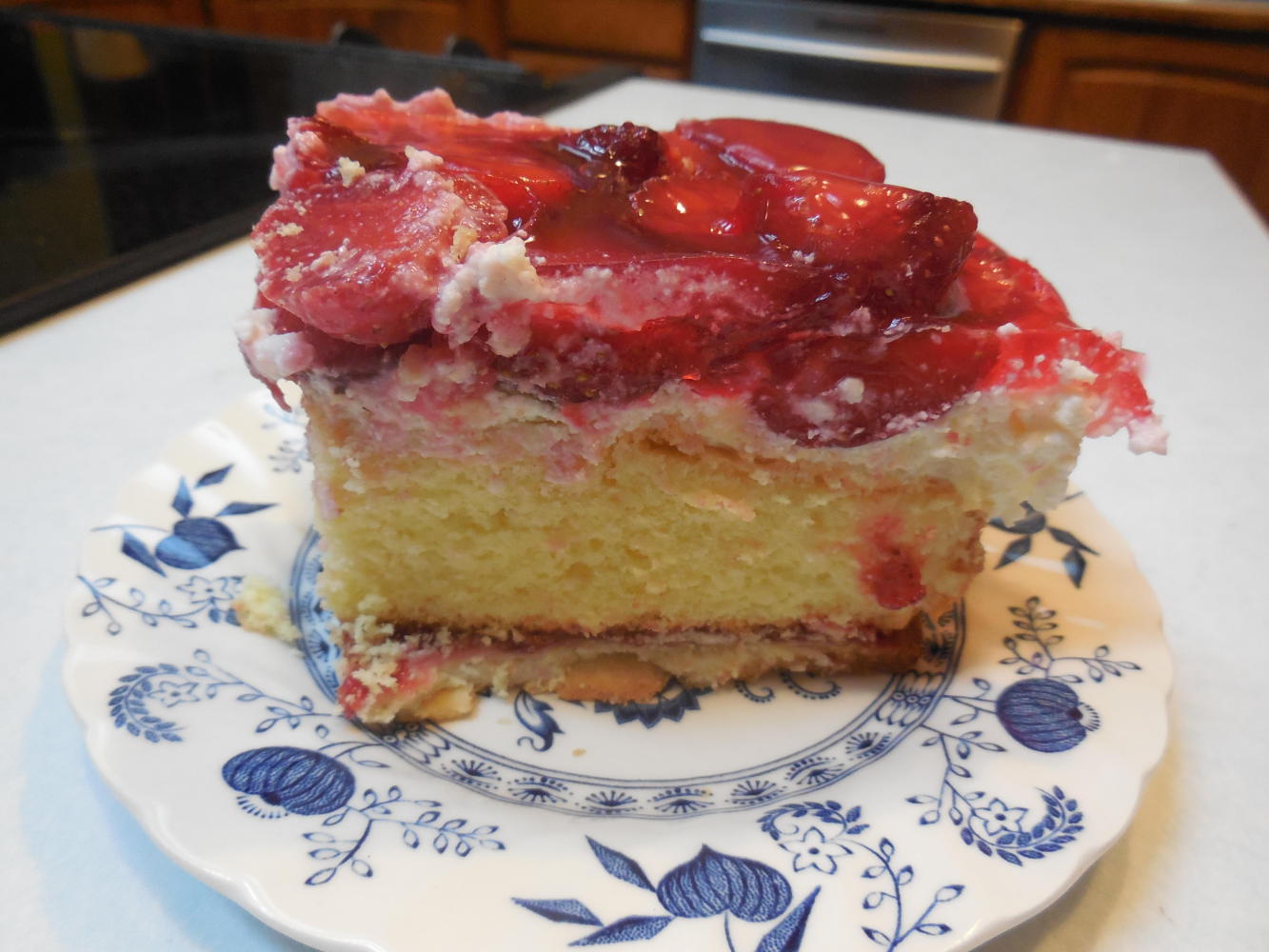 Well, on arriving back from Europe last time, I decided I could recreate some of the magic by making my own schnitte. Unfortunately, as with all great baked goods, it is never as simple as it looks. The things to think about are what is the cookie like base made from? Does a jam layer follow? How do you make that plain cake so that it does not taste quite plain? Could you use Betty Crocker yellow cake mix? And should there be a pudding, or is it cheese (quark) layer next. Finally, should the berries be drowned in gelatin, or strawberry jello, or something else? Whatever it is, how do you keep the gelatin liquid from soaking into the cake before it jells?