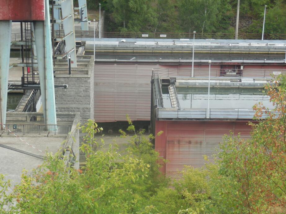 The idea is that boats go into a sort of bathtub on a rope, and this gets dragged up the hill. Here you see the tub, on the right, just getting ready to rejoin with the main canal.
