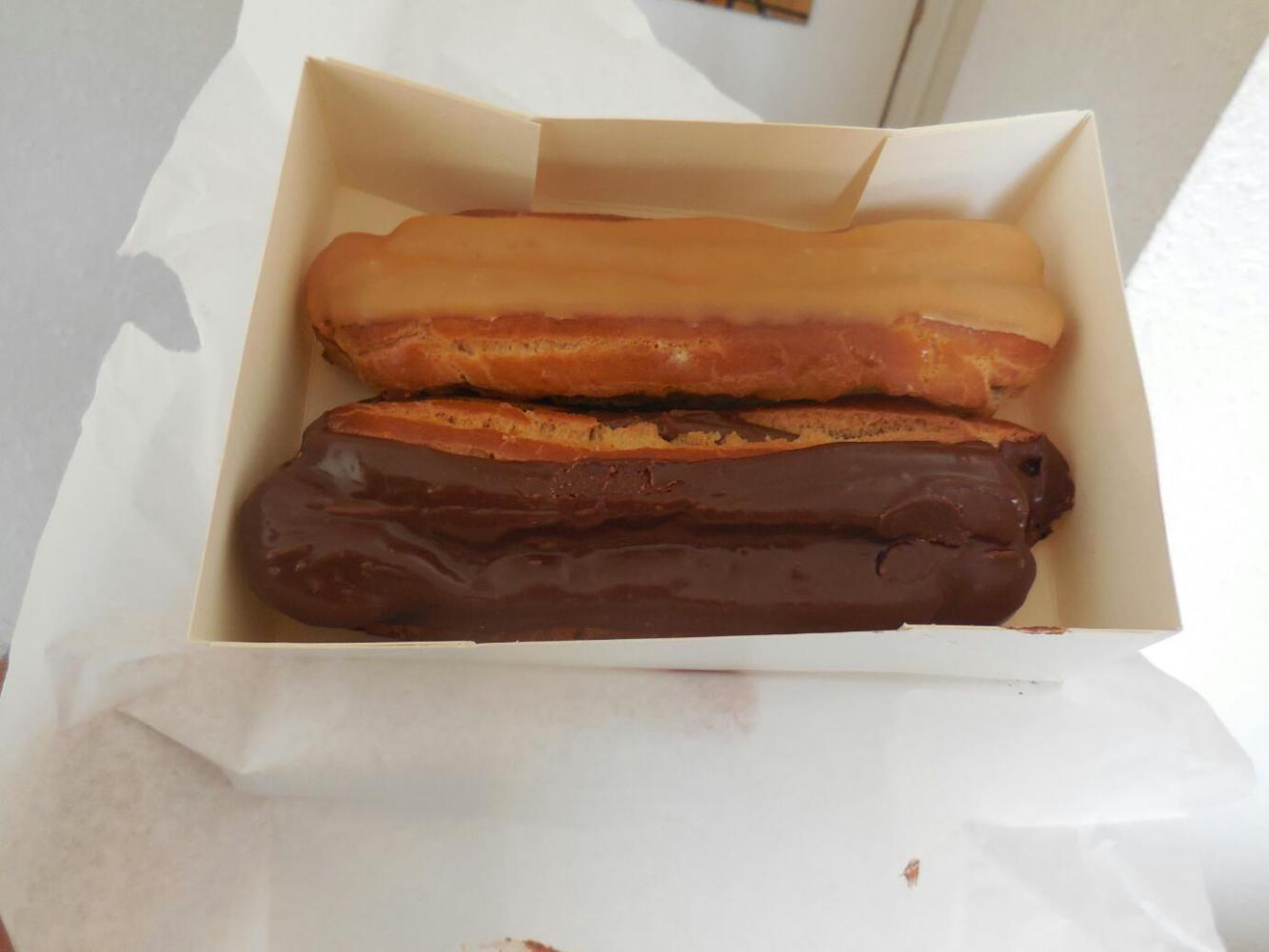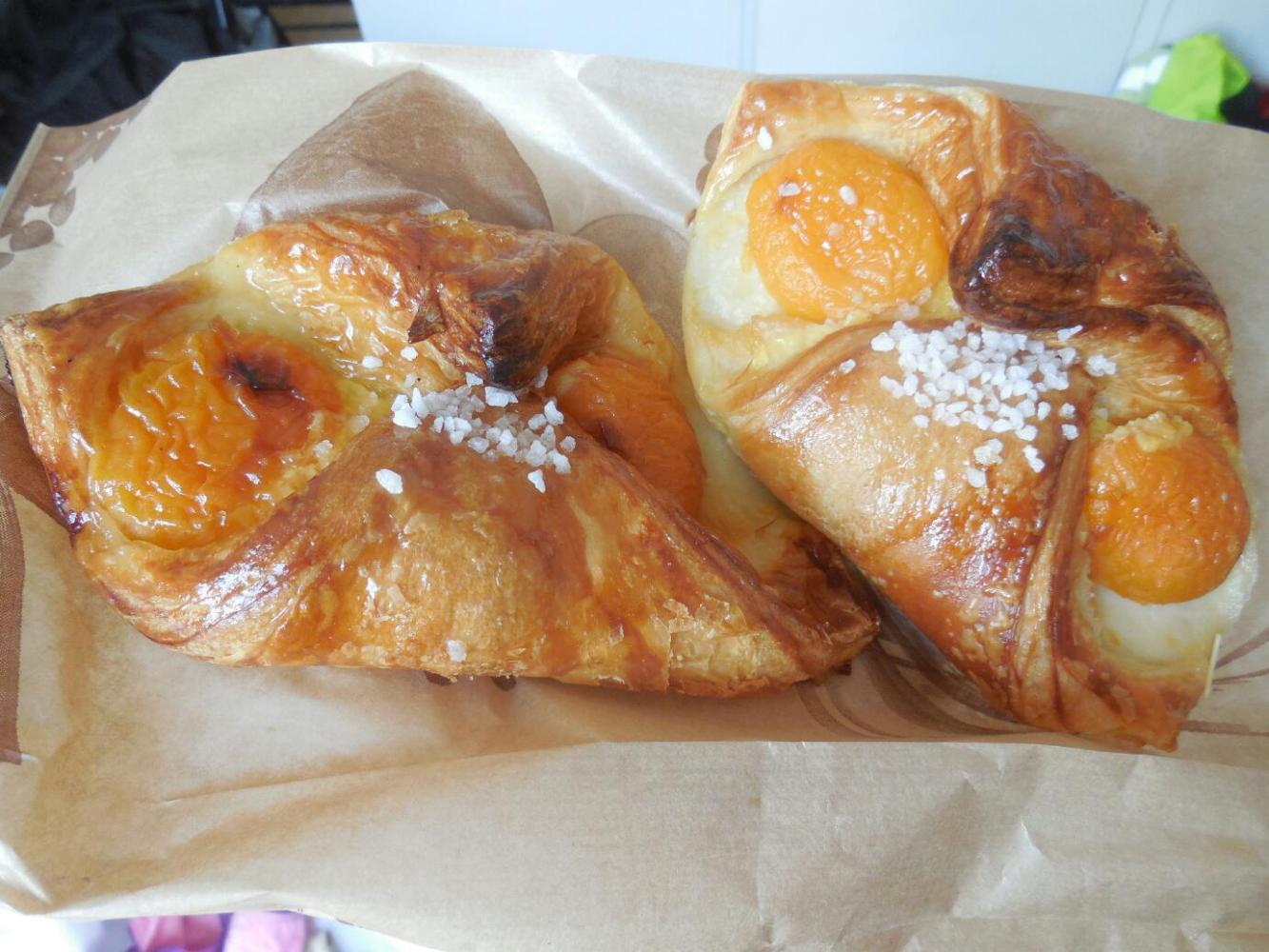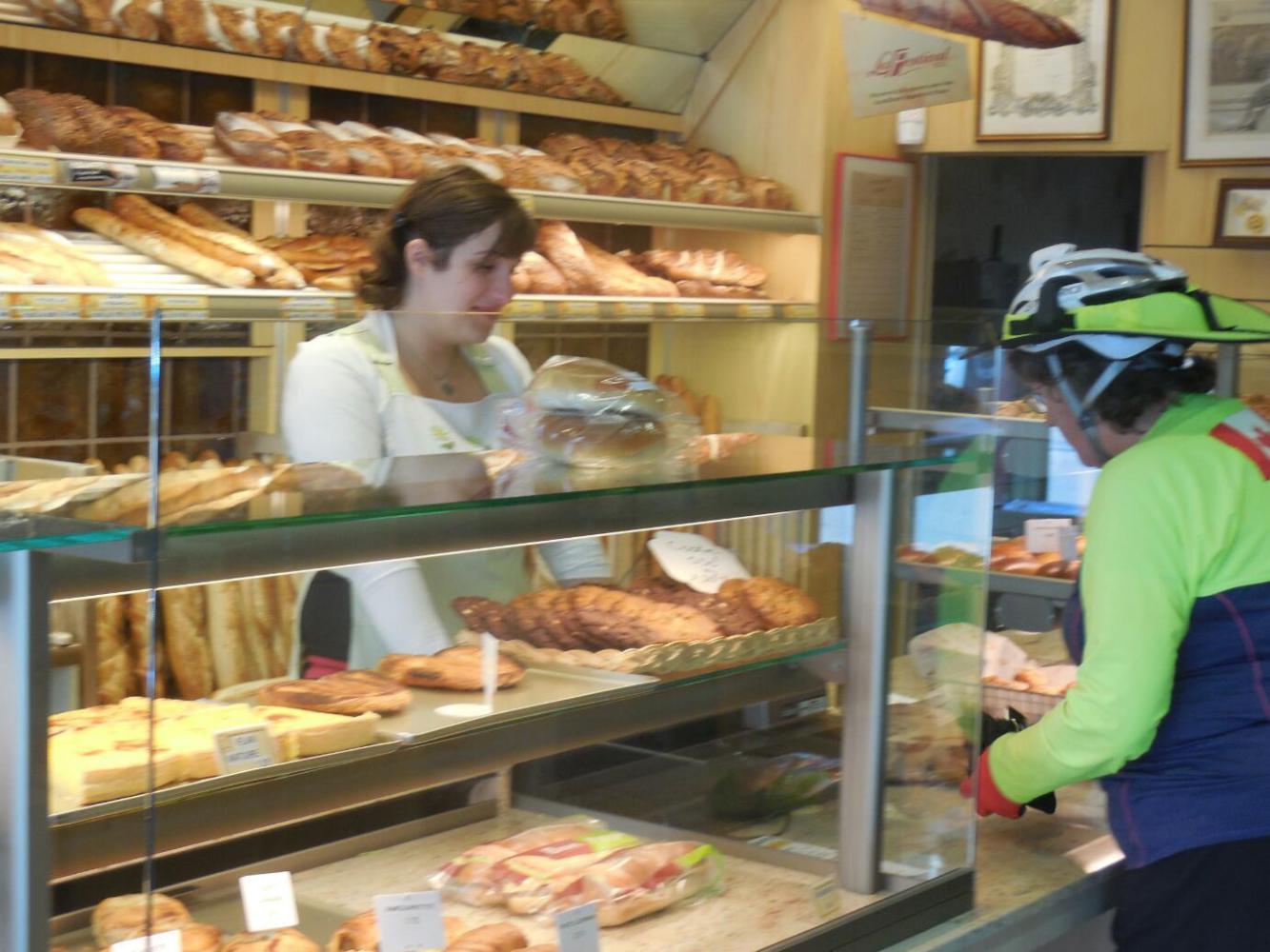 So I threw on my clothes and headed on down. I chose the left hand bakery, since that had been recommended by the hotel lady. I was under instructions to get something for breakfast, and some sandwiches for later. Once inside, though, I was dazzled by all the colourful stuff, and came out with choices that were not really appropriate for breakfast, and not good for carrying on the bikes. That is, refrigerated eclairs, and open face apricot pastries. (Yes, I did actually get some sandwiches too).