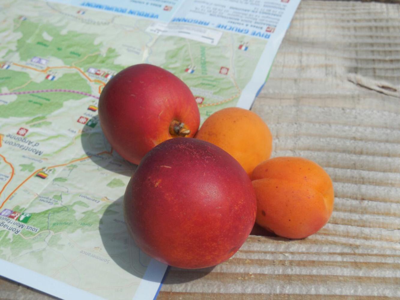 A glance at one of our maps revealed the wide forested ridge that we were climbing, and showed the broad plain that eventually we swooped down to. Just at the base of this swoop was a farm stand type shop, with fruits and cheeses. We chose apricots and nectarines, and sat at a picnic table to eat lunch. It was already time for lunch, though we had made only 15 km!