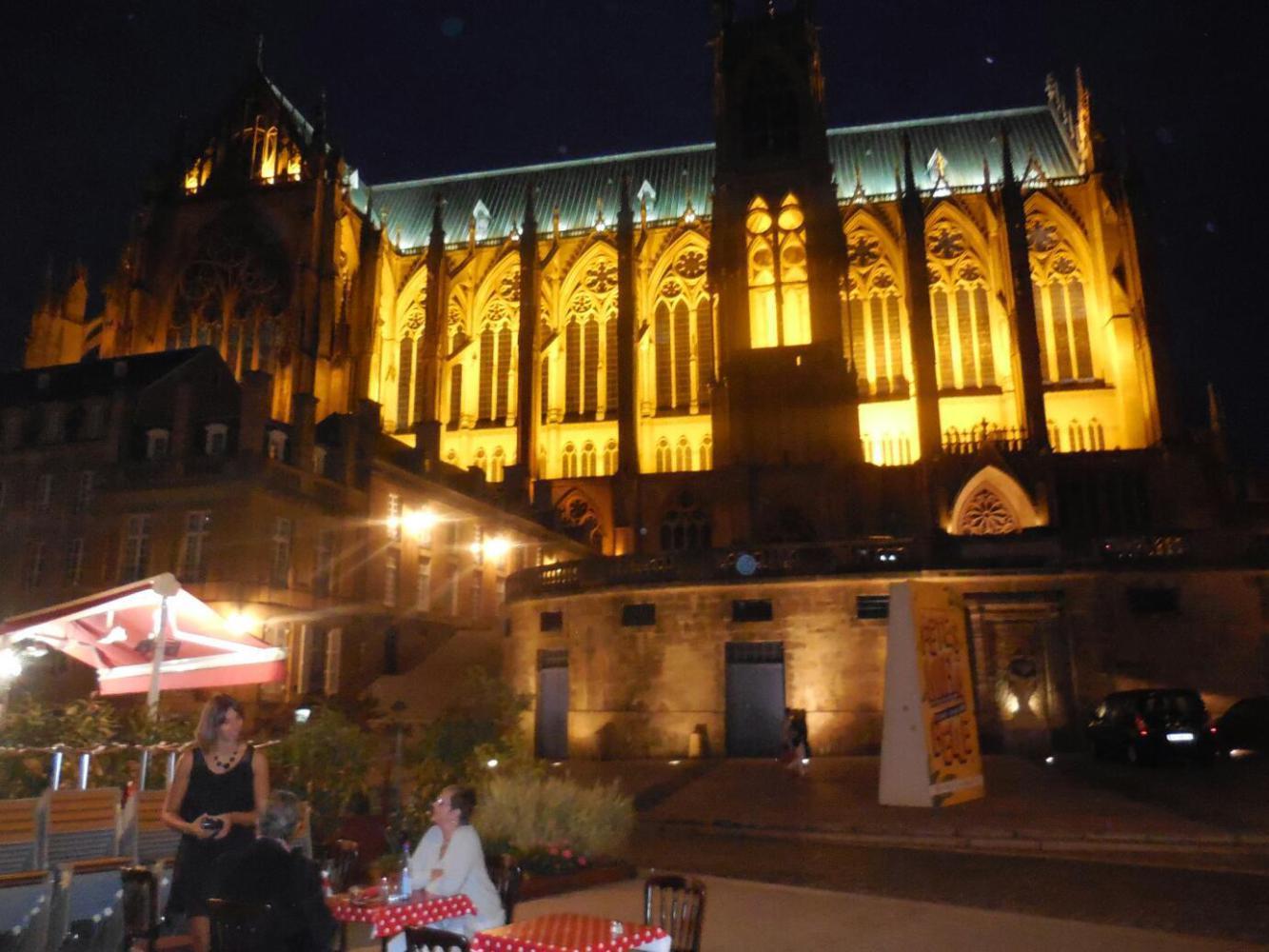 Dodie was really exhausted and I was frazzled as we entered Metz. It was about 9 p.m.! At such an hour we wanted a hotel, though we saw the signs for the Metz municipal camping. I remembered that our hotel last year was in front of the cathedral I insisted that we head there. The cathedral tower was clearly visible, so no problem. Who would guess that Metz maintains a full size decoy cathedral tower! It's a ruin of some sort. so we had to leave the decoy and find the real thing. For exhausted people, not so easy but we did it. I really hoped that there was truly just one more cathedral, because Dodie did not have enough gas in her tank for any more running around.
