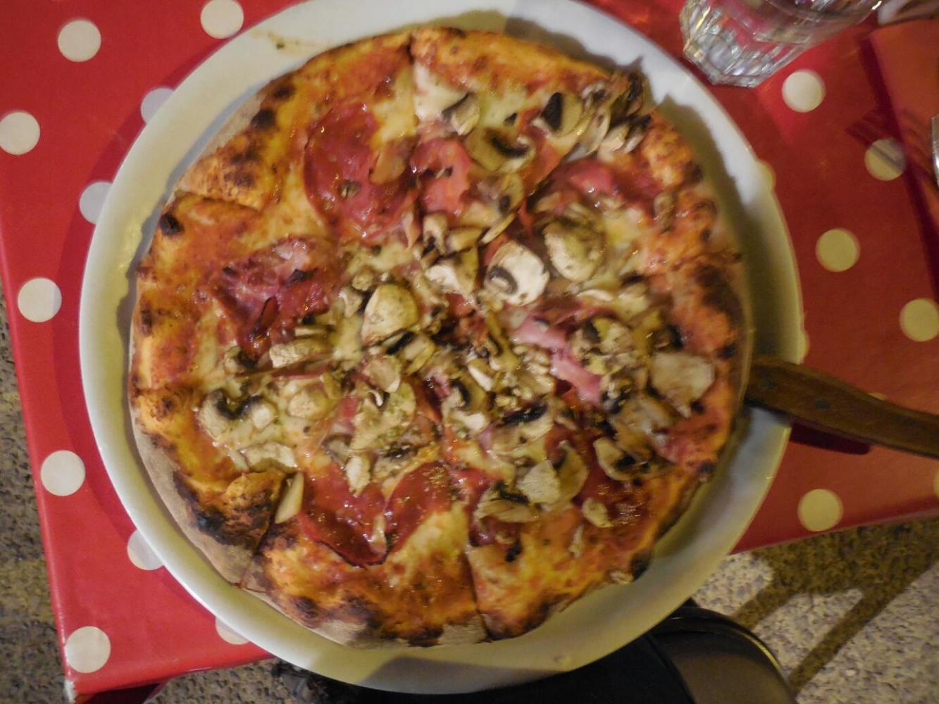 Fortunately we pulled up in front of the real cathedral, and there was our hotel. They had a room, but it was €85. I cried loudly enough that this got reduced to €71.50. It was number 309. Who would think that three floor could be so high! I ferried several loads up the winding staircases, leaving Dodie below. Then we moved over to the Italian restaurant just down the street. Dodie claimed to be too tired to eat, but I insisted. I did not think she would get up the stairs without some fuel. I ordered the pizza, which I knew from last year was super. It did not disappoint - clearly brick oven cooked and with great cheese and topping.