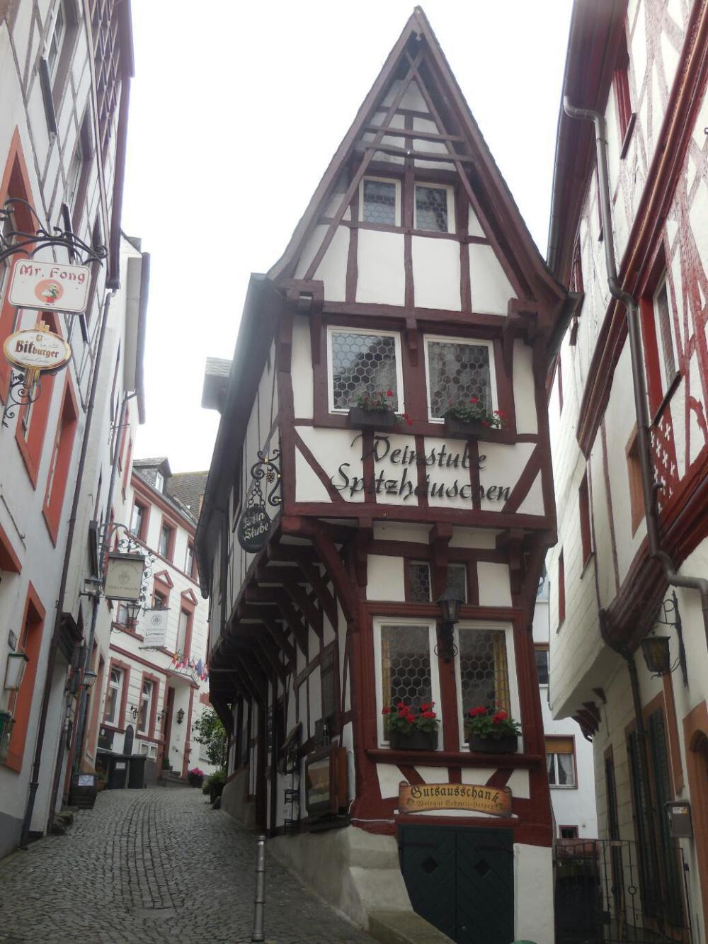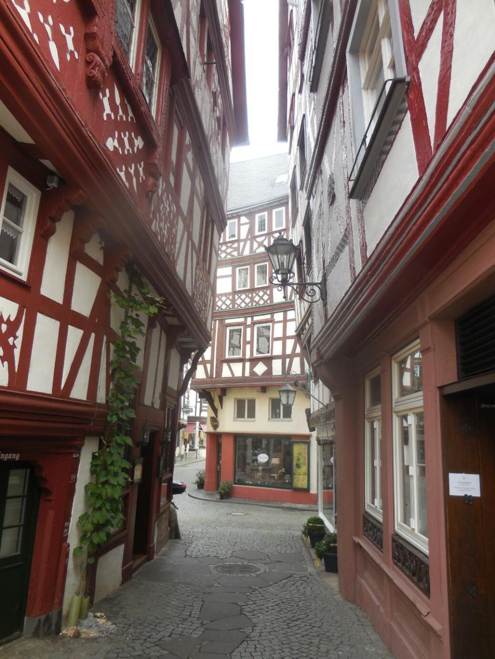 The morning was misty, giving the town and the surrounding vine covered hills a further artistic touch. We passed into the oldest section and were treated to scenes of beautiful fachwerk buildings. It is a pedestrian only zone but delivery vehicles are exempted from the car ban. So at this hour there were a few of them around, including one giant truck. The truck made it really difficult to get an unobstructed photo of anything. But, I tried.