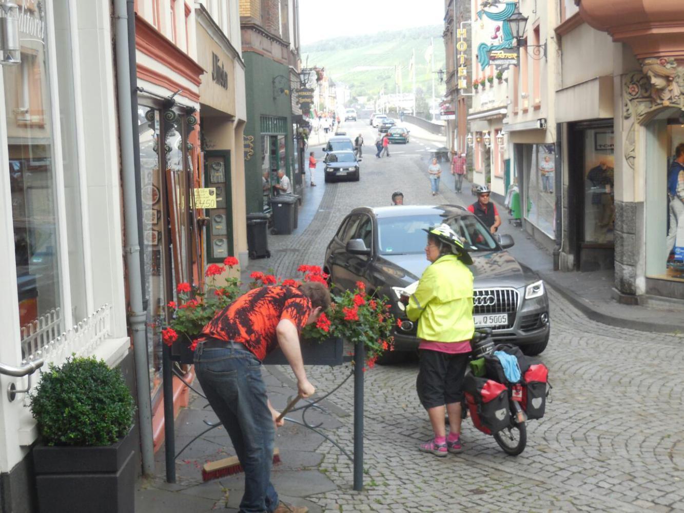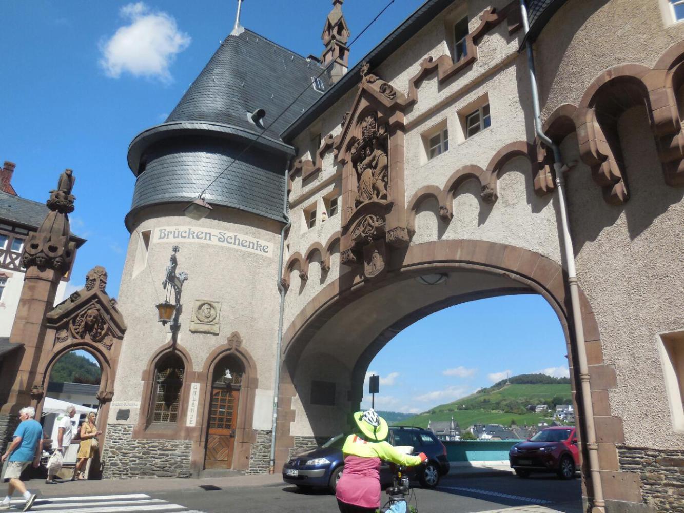 Bernkastel is the docking point for a number of river cruise boats. As we pedalled along the dockside path, there were groups (crowds) of people waiting to board. Dodie dinged her bell, and the crowd parted. As we passed through, we said hello to them all, and they applauded and cheered.