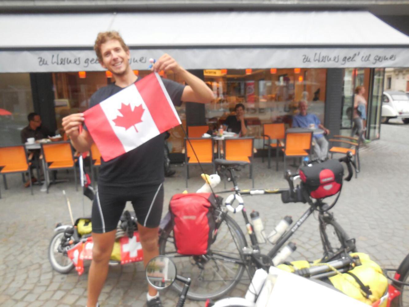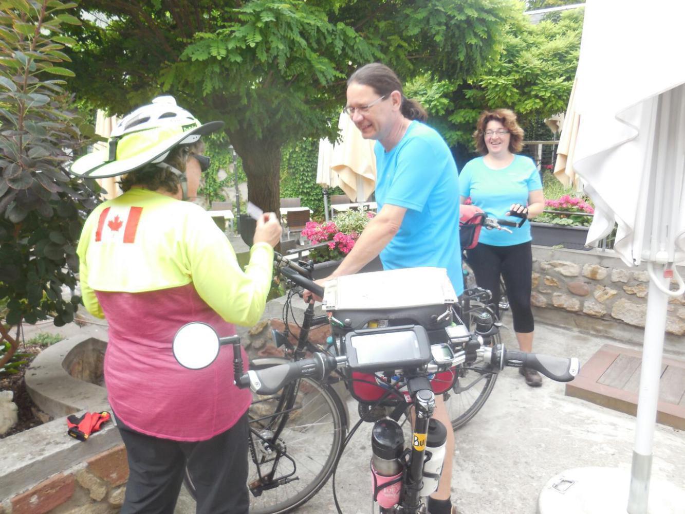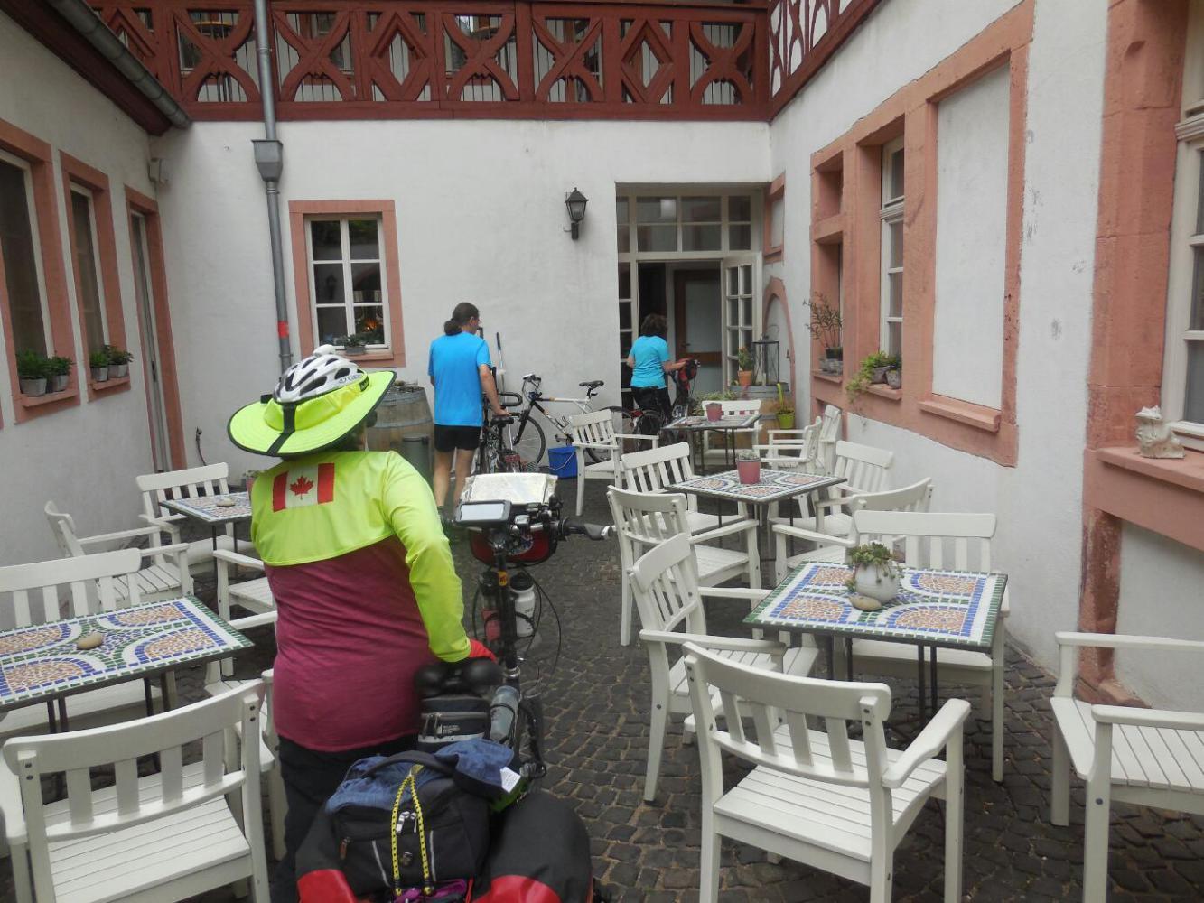 As we headed from our hotel towards the river, and our path to Frankfurt, Dodie suddenly pulled up. She had spied a Canadian flag on a bike parked at a cafe. The cyclist behind the flag was indeed born in Canada, but currently lives in Switzerland. Still, we enjoyed talking, because like Franceska yesterday, he and his buddy were really packed and had interesting extraneous stuff hanging off their bikes. In short, "real" tourers, rather than the Guesthouse jumpers that we ourselves seem to be becoming!