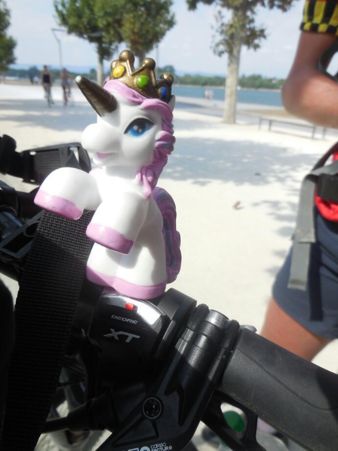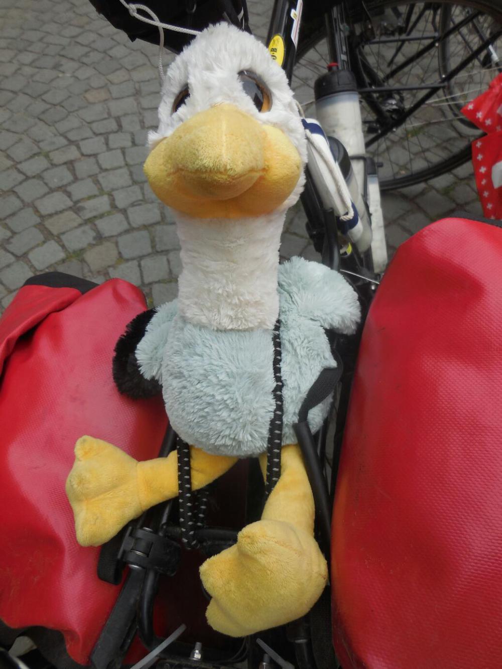 One of the hallmarks of a "real tourer" may be the mascot. Perhaps real tourers are spending longer on the road, and get lonely, but these often take the form of a stuffed animal. We did have that in the past, including a big stuffed dog that we found on a fence in Quebec. Here is the Canadian/Swiss guy's mascot, followed by that of Franceska from yesterday. We ourselves are reduced to mascot "tokens" - Dodie has a metal keychain turtle, denoting her ultra slow status, and I have a Pope Francis medallion. Francis joins St. Christopher in a supervisory capacity, since Christopher did a questionable job for me in Florida.