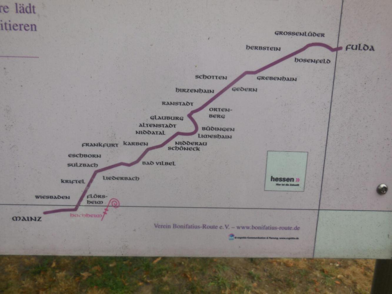 From this point (until well past Frankfurt!) the Main radweg is quite boring. That probably accounts for the inclusion of this story: In Mainz there is a statue of St Boniface. This means something to us, because we lived for some years in Winnipeg, which has a major suburb called ...St Boniface. Apparently St Boniface is well known hereabouts, and we found a marker along the path (in Hochheim) that says his body passed this way in 754 as it headed to the saint Peter and Paul church in Fulda. Fulda is famous of course, because the (live) bodies of Ken and Trish Graham passed by there as recently as August 6!