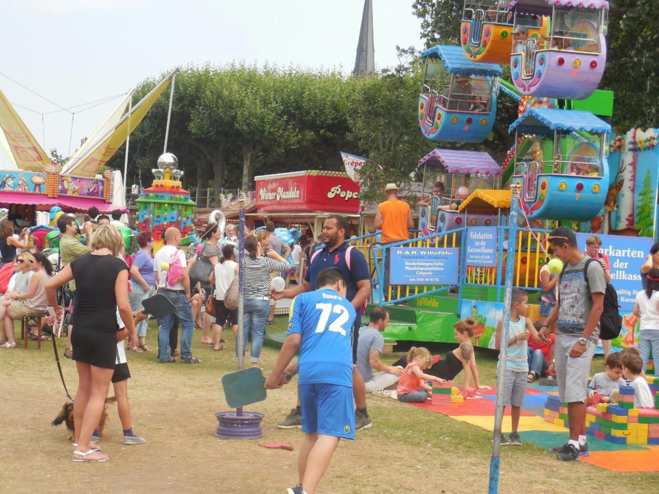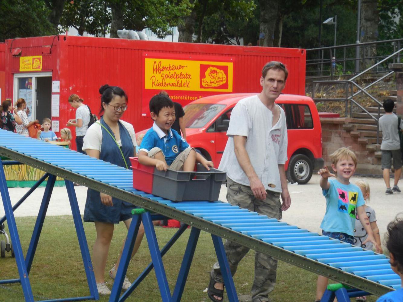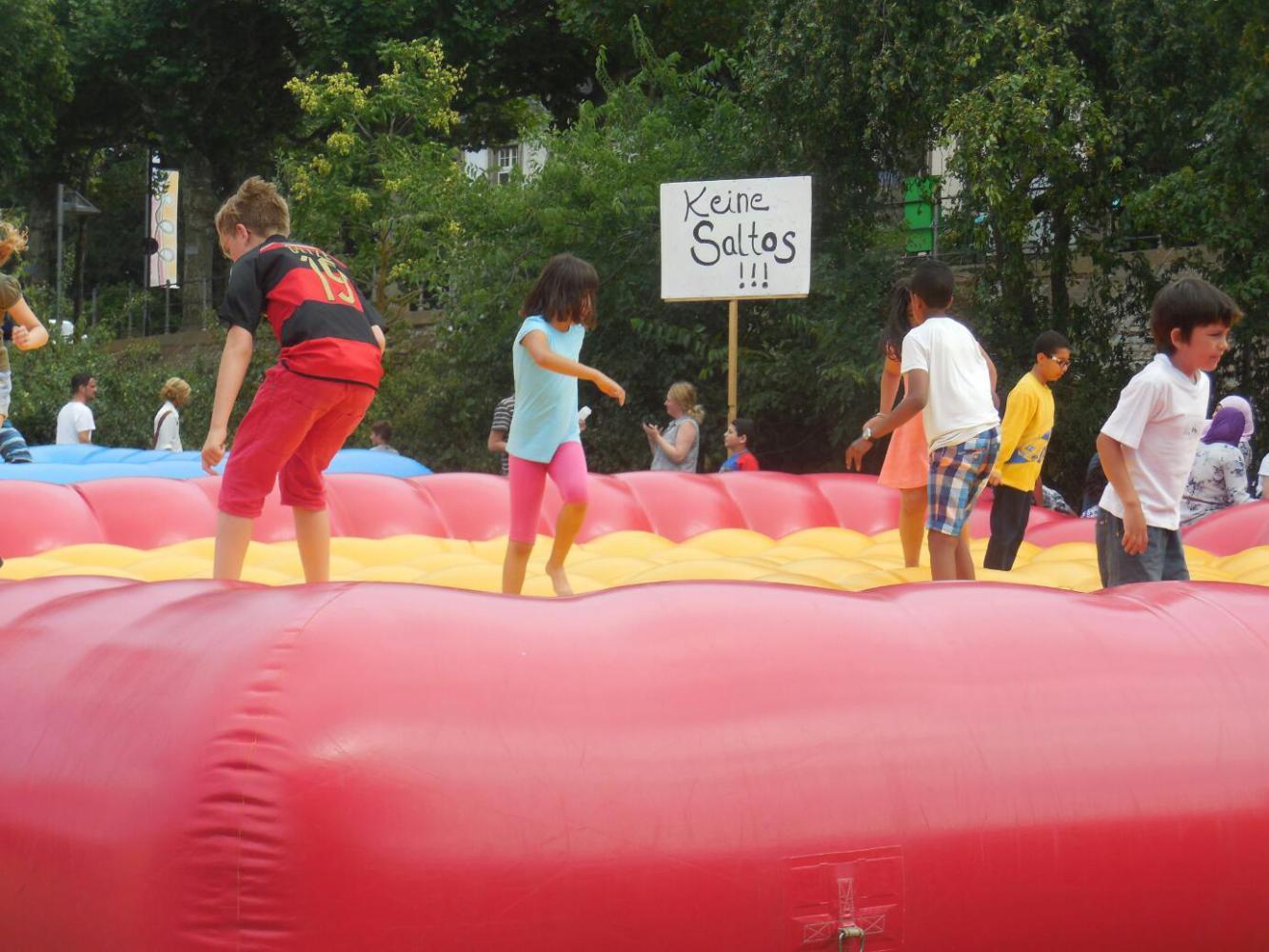 As planned, we took to the bank of the Main opposite Frankfurt, so as to give the city a miss. On this opposite bank we did find something interesting, in the form of a series of kids' activities, strung out along the bank. This was not crafts or music or anything like that, but active stuff like bouncy surfaces, sand boxes, climbing, and sliding type things. We learned that this is set up each year by an outdoor activity association. All the things are free, and looked like great fun.