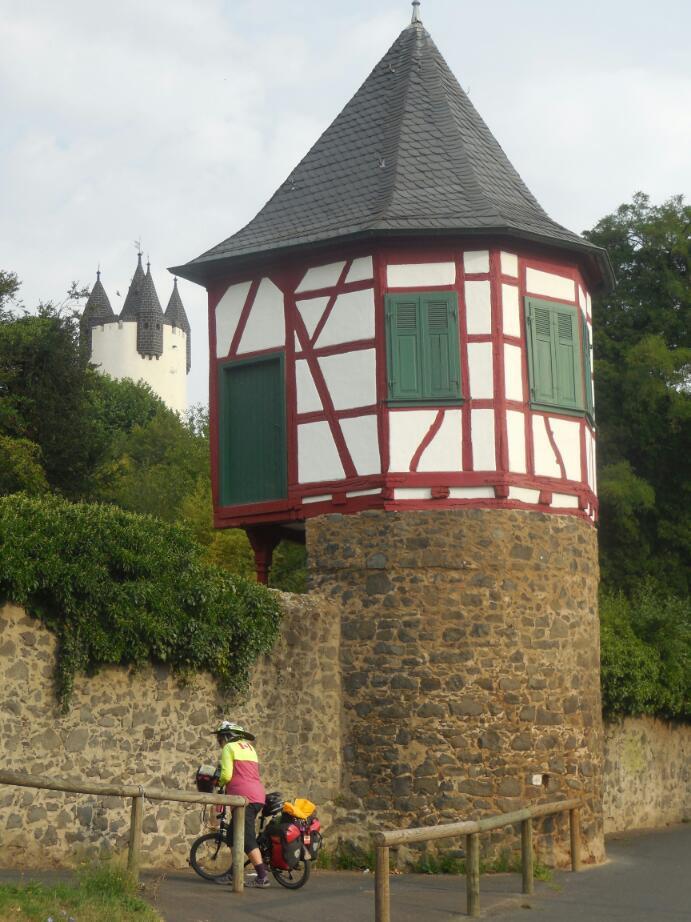 The first chore was to actually find how to make an assault on the city. There were steps up, but of course those are of little use for us. Further along the Main there was indeed a steep laneway, that took us up beside the schloss and to the tourist information. Tourist information found us a guesthouse (a B and B really) just beyond the pedestrian district. The very nice lady there plied us with cold mineral water, while instructing us closely on where to put our bikes, bags we would need, bags we did not need, about the front door key, the room key, the breakfast time, whether we wanted tea or coffee, what kind of tea, and so forth. We were pleased to cope with all this, just so long as the cold mineral water kept coming!