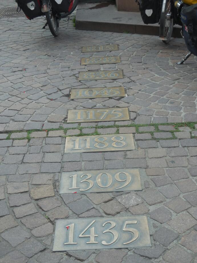 The next town along for us was Seligenstadt. Now this is a really serious fachwerk town, ans we think we saw a mention of it being on the German fachwerk trail, or somesuch. The main square had a whole array of beautiful examples, and there was not one but two or three bakeries easily spotted around! A sequence of dates was set out in brass plaques in the floor of the square by the fountain, each date representing something important in the town's history. The key facts for us were that the first date was 815 a.d. and that not a darn thing happened (apparently) between 1859 and 1977, when the lst thing happened in the town.