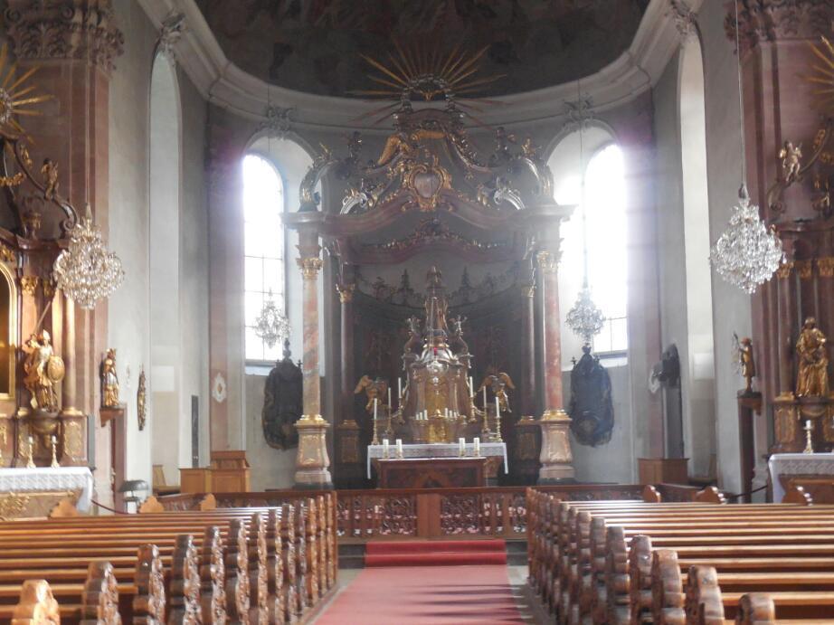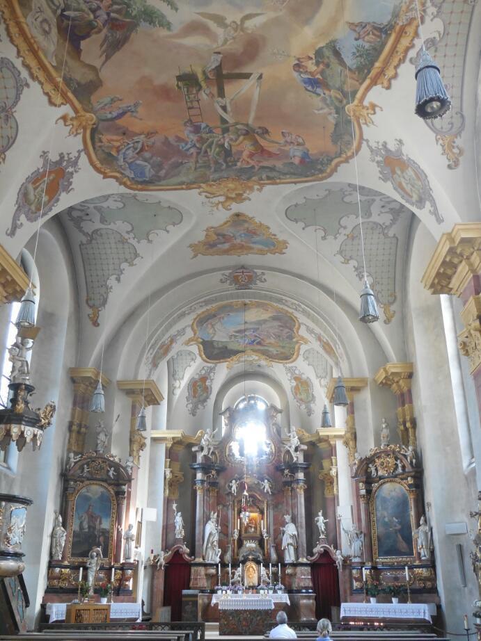 A shower for each of us put us in condition to sally back out into the town on foot. As usual we like to look in churches. Now that we have crossed into Bavaria (Franconia, really - Bavaria aquired Franconia in the early 1800s) and now that we are in the predominantly Catholic region of Franconia, the churches feature more gold and more elaborate statues and decorations. That makes them automatically more interesting for us.