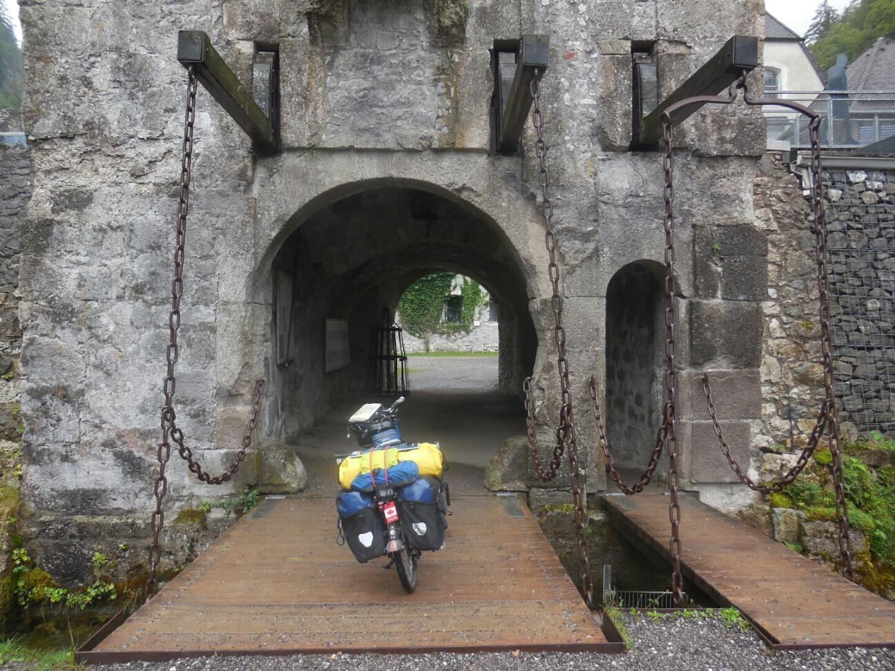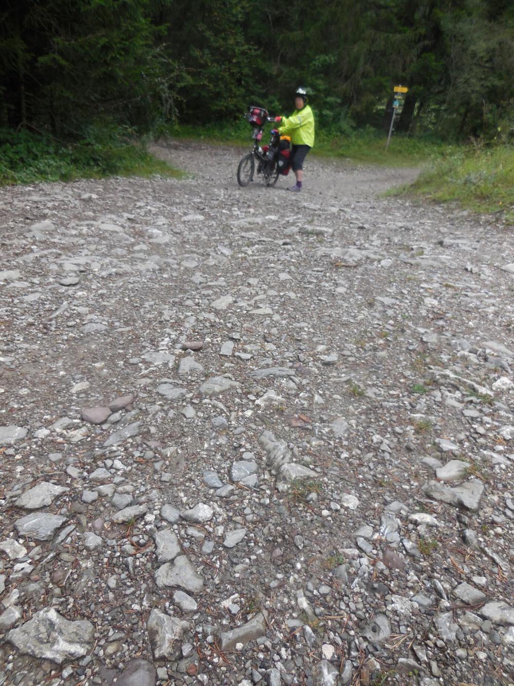 We looked at where the bus went from and to, and read the email that our friend Trisha had written us about it . Trisha noted that out of Reutte there was 8 km of uphill gravel bike pushing, on the way to the bus departure point of Biberweil. Trisha also said the shuttle had dumped her and Ken in the middle of nowhere, at Schloss Fernstein. This was puzzling, since the shuttle materials said it went to Nassereith. We got our phone working (actually, it decided on its own to start working) and reserved a room at Nassereith. Then we asked the hotel lady to arrange the shuttle.