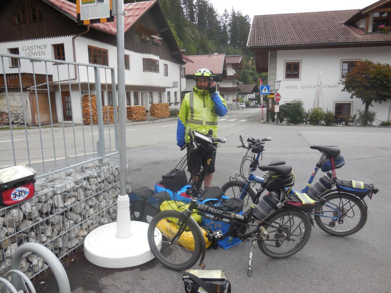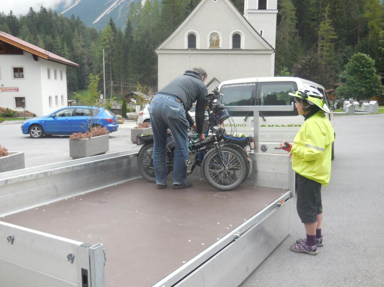 We battled the gravel and poor signage and eventually rolled onto the small main street of Nassereith. And here walking along it were Bjorn and Julia! They had planned to give the shuttle their luggage and push the Pino over the pass on the rough track. But the large flat deck trailer had given them a chance to have the whole thing teleported. We think that is good, because at the other end we saw no secure place where a person's geat might have been delivered. Would it have ended as a pile by the road side?
