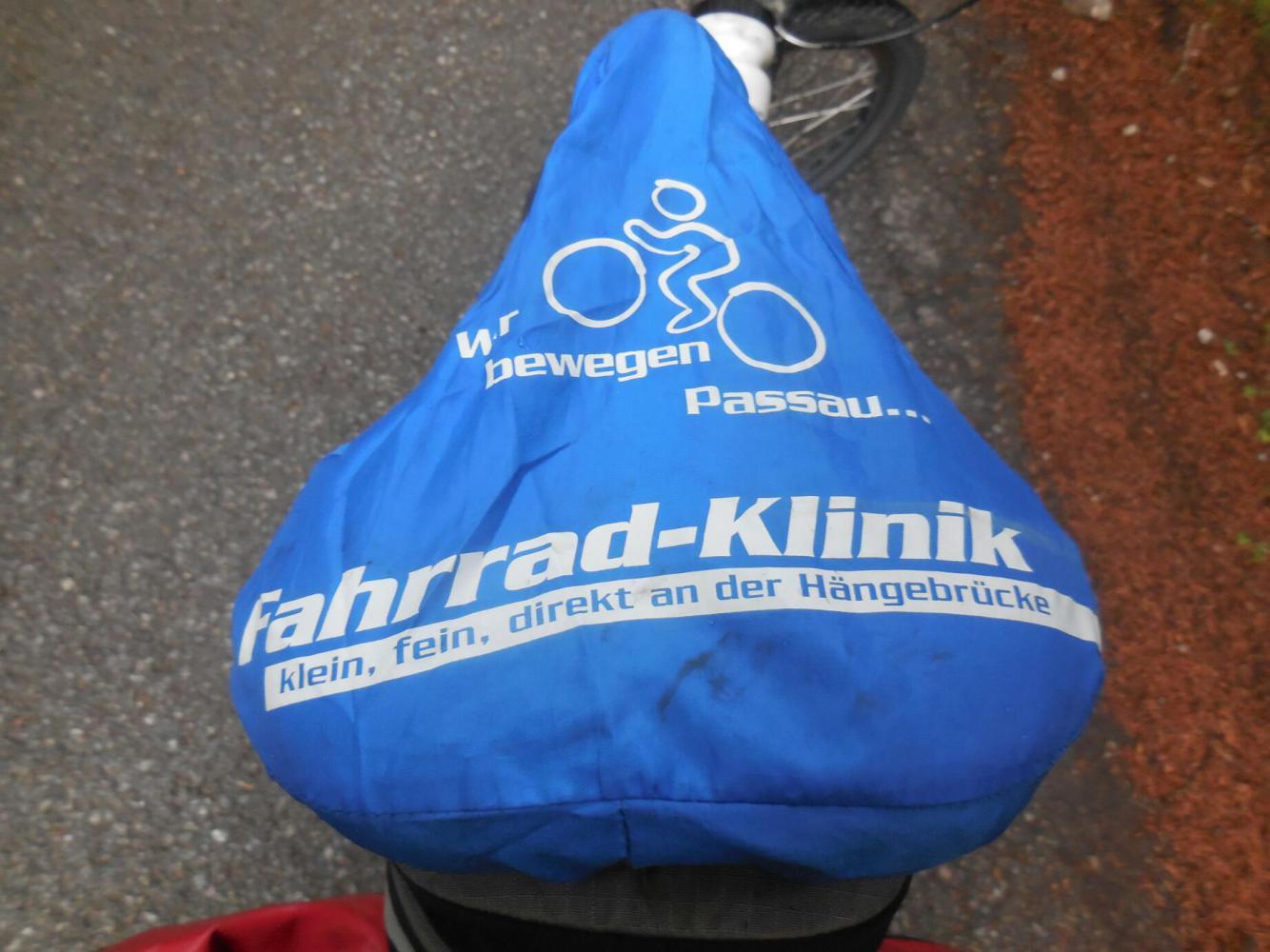 In this case, we unloaded much of the bikes and dragged out, first off, the official Canadian cure-all duct tape. Next came a plastic seat cover. Ironically, it was from Fahrrad Klinik, our favourite shop in Passau. The Klinik part was appropriate here, for the seat needed a "hospital" to avoid oozing to death.