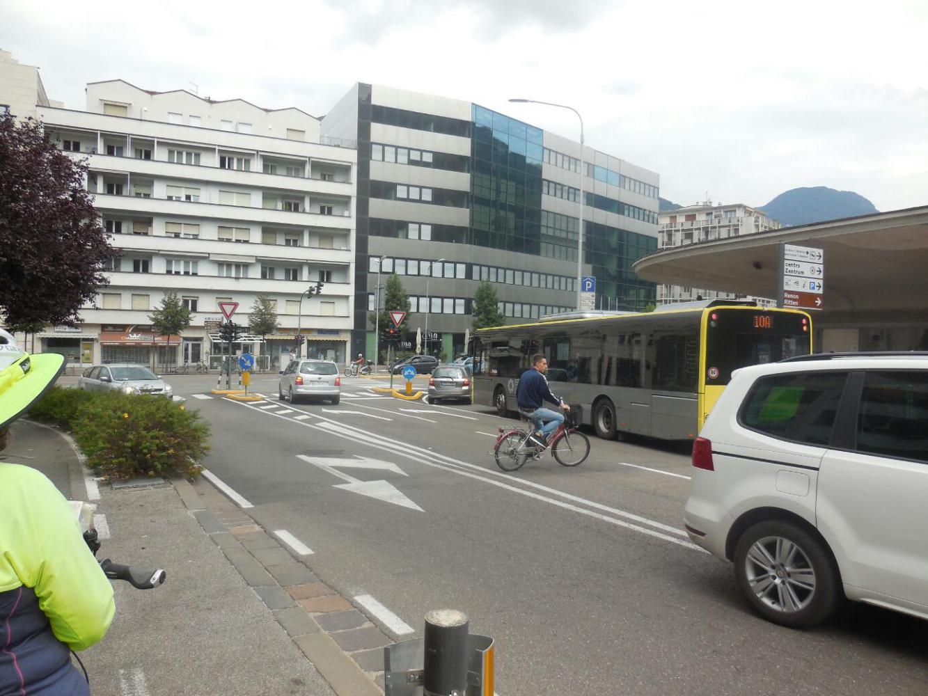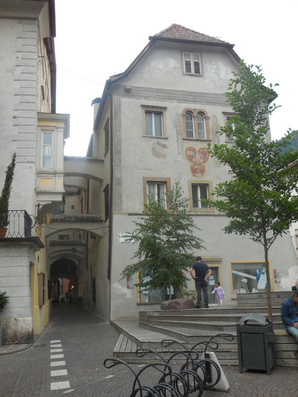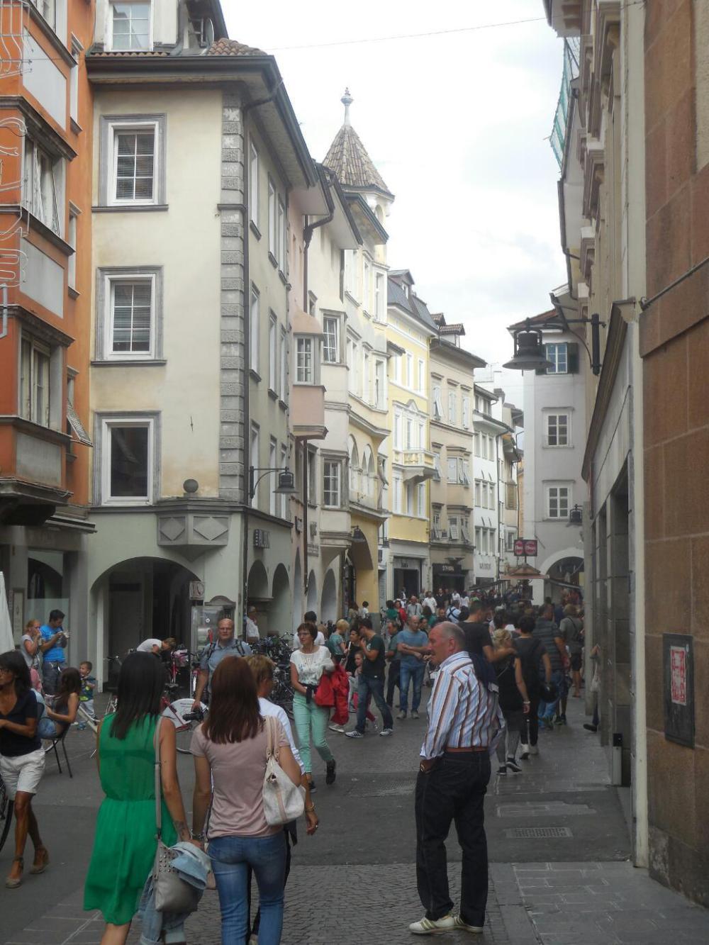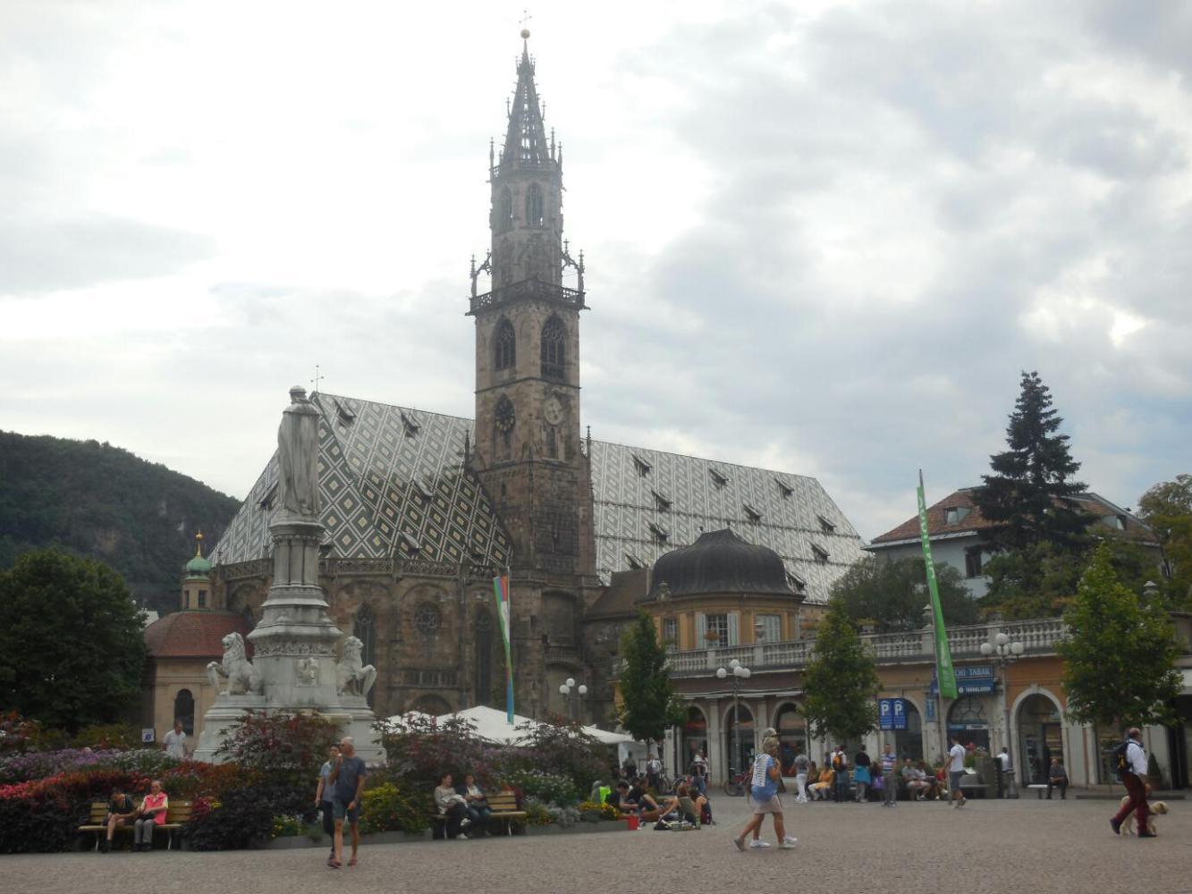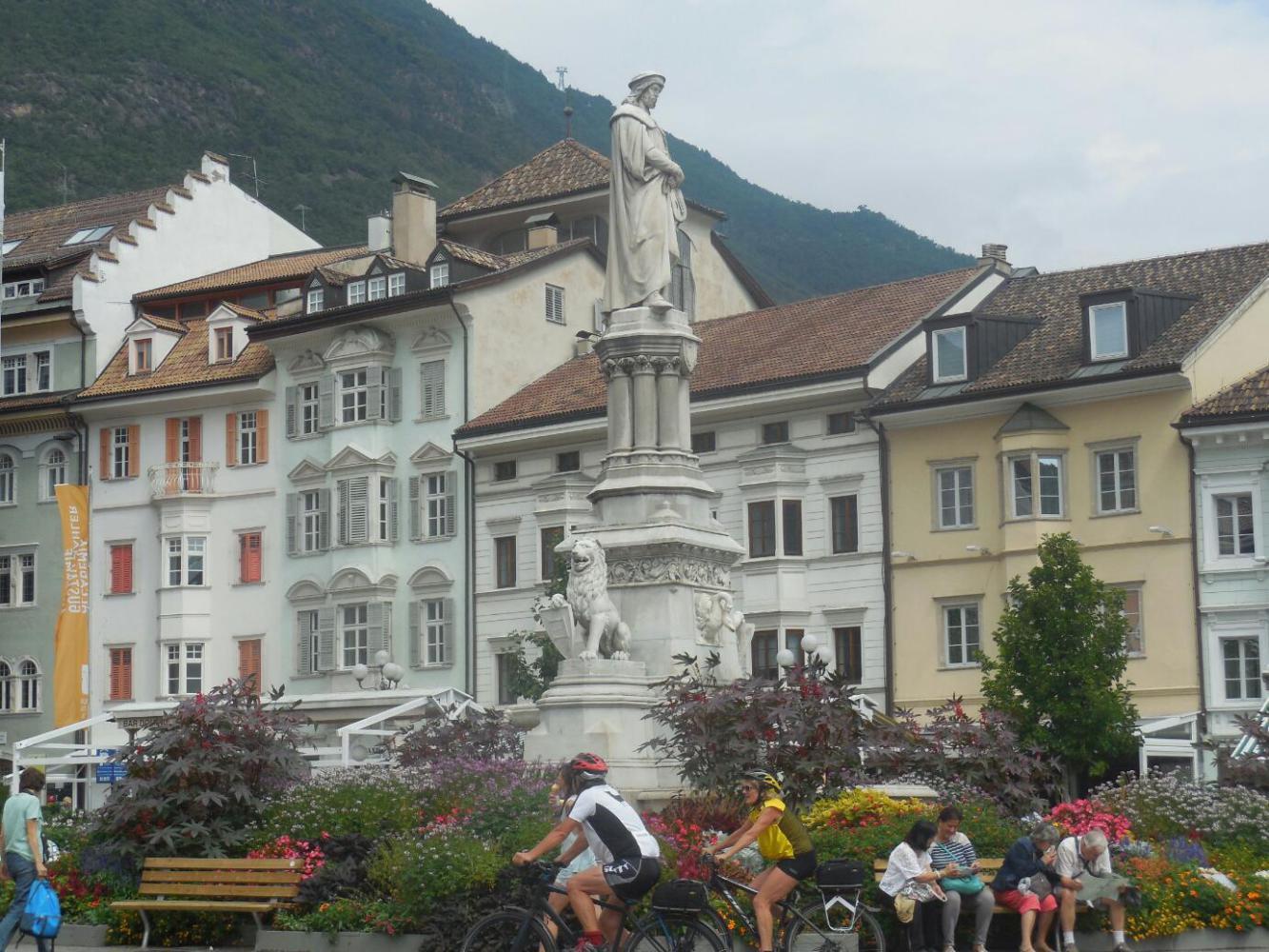 It took a really inordinate time to get from the countryside into the old city at Bolzano. It seemed we crossed the river, crossed back, went up the hill, down the hill, cross another river, and still we were in outer areas filled with nondescript apartment buildings. Things were so nondescript that I could not decide on a representative photo to take. It all seemed so ... nothing. Finally, after 5-10 km of just back and forthing, we burst onto Walter Square, which is the centre of the old town. Here at last were the recognizable and familiar Dom, fountain, and outdoor restaurants.