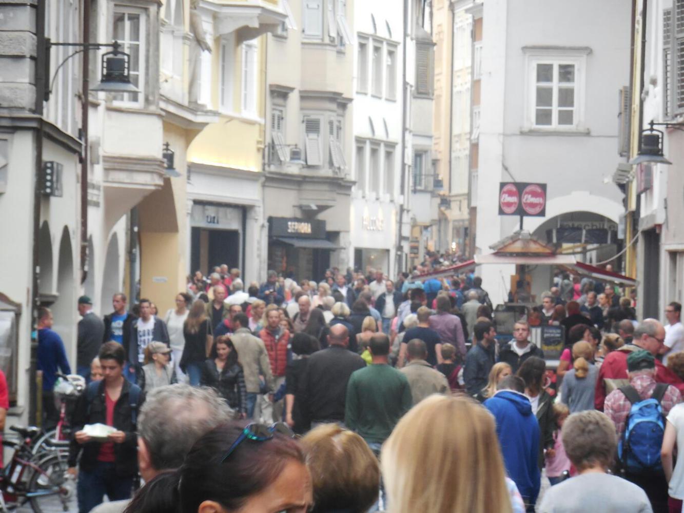 We had graciously declined the ripoff 12 euro each breakfast (croissants and coffee) at the hotel, and set off to the market to find some affordable real food. To get the ball rolling, we bought one pastry each at the Franzikaner Bakery, on the way. Thank goodness, Bolzano has many bakeries and every one we found had real (like, really real) German baking. We then passed through Walther Square and to the fairly small market. Our first choice was some large peaches. They were ripe and had a unique apricot like colour inside, but unfortunately were tasteless. We thought about buying bread, salami, and cheese, but given that the bakeries were selling this already as made up into sandwiches, we put that idea aside.