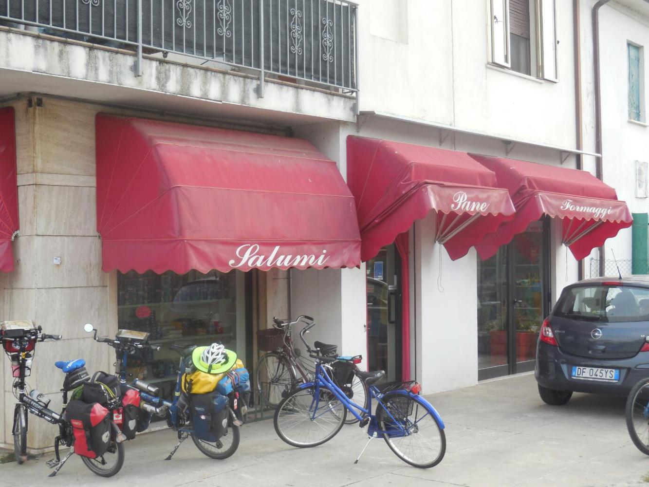 We passed the little town of Serravalle, and thought about coming off the dike for a break. "One of us" said - look we can make it to Berra, just 5 km away! After 2 km, the other one of us declared she probably could not make it to Berra. But we found a snippet of shade, rested fot 5 minutes and that allowed us to roll into the sleepy town. Dodie found a shady table in a park, and I found a fruit seller with nectarines. We spread our tent, bags, chairs in the sun, because all had goten soaked in the overnight dew in this moist land.