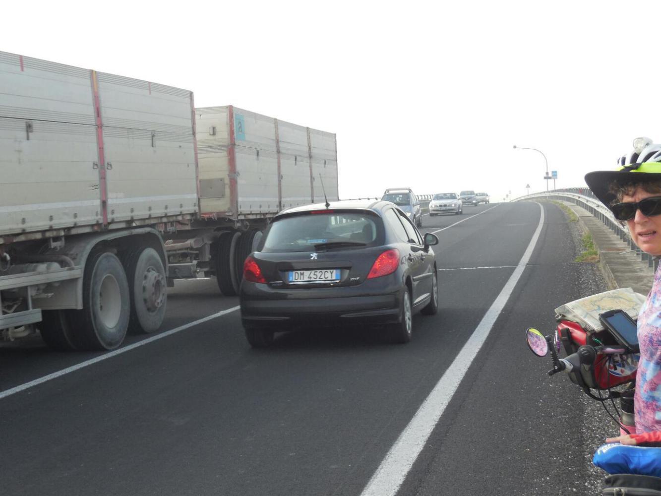 We set off back a couple of km to get onto the bridge, and were relieved at first to see that the access road had a shoulder. But what of the bridge? Hooray! The shoulder was small but usable. The Po is very wide at this point, accounting for the huge bridge. But over we went, and even better, the road beyond had a shoulder too.